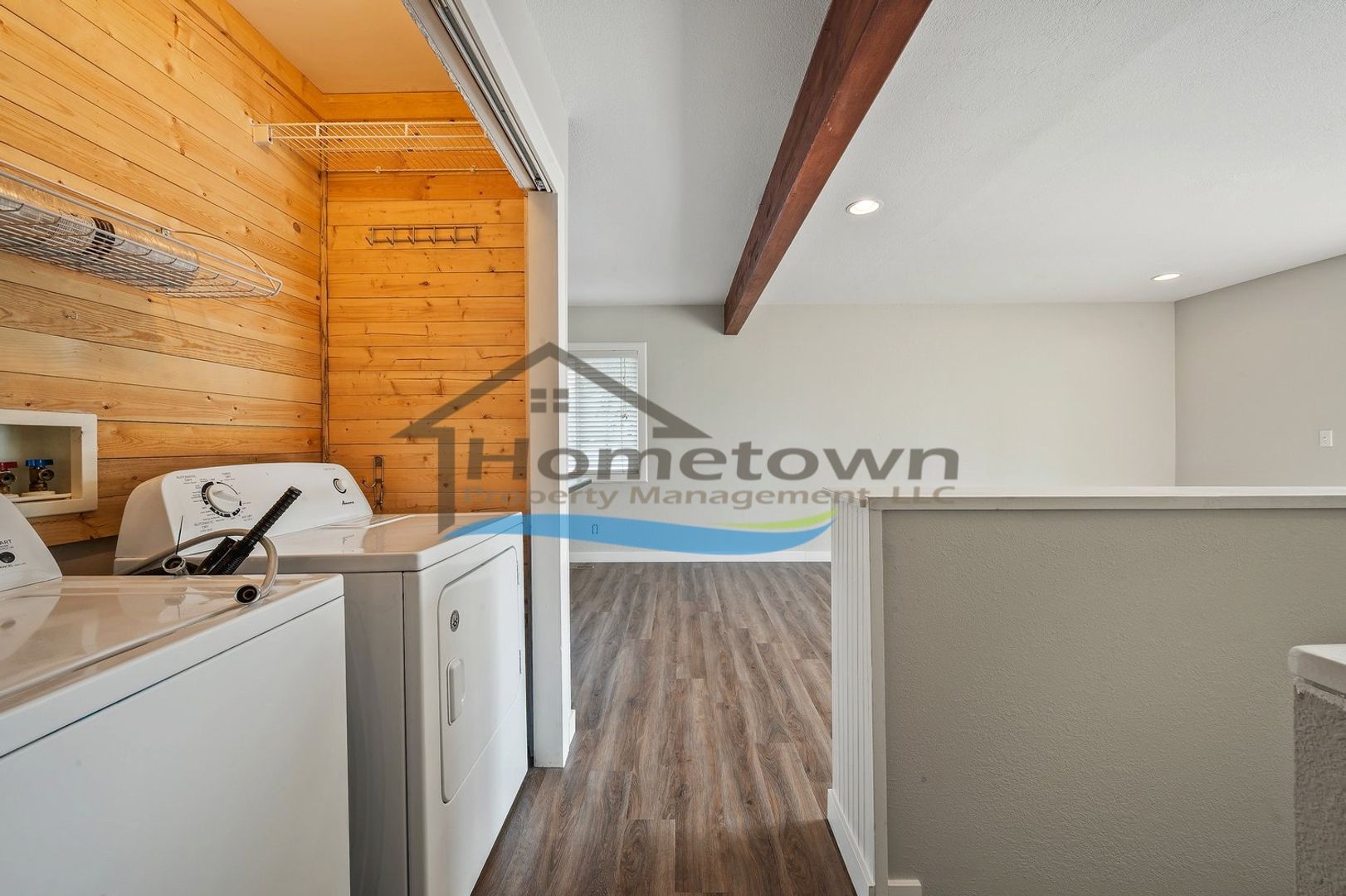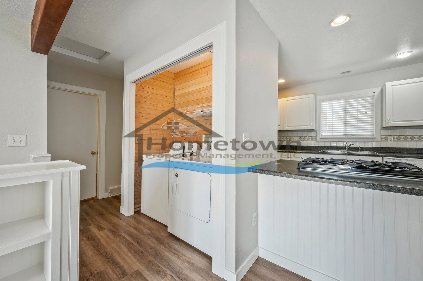 The living room includes built-in shelving for added storage. A hallway leads to a laundry nook with washer and dryer hookups, a primary bedroom, a full bathroom, and a guest bedroom.