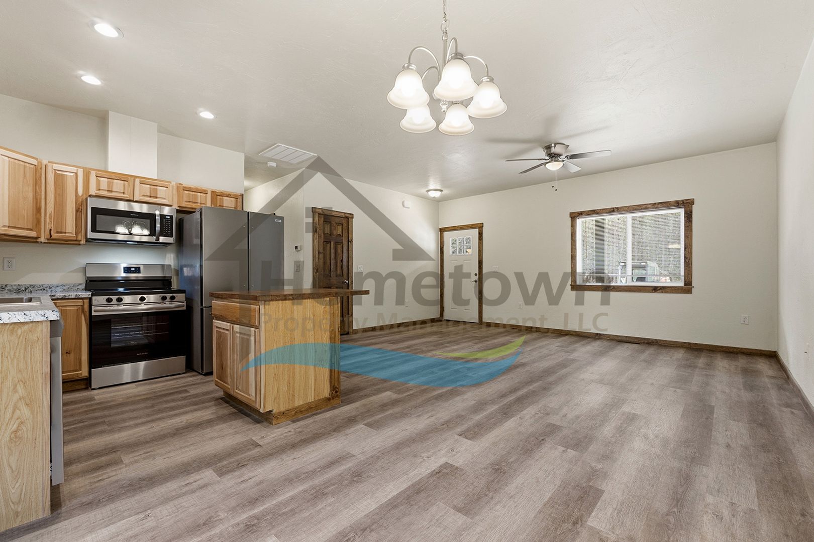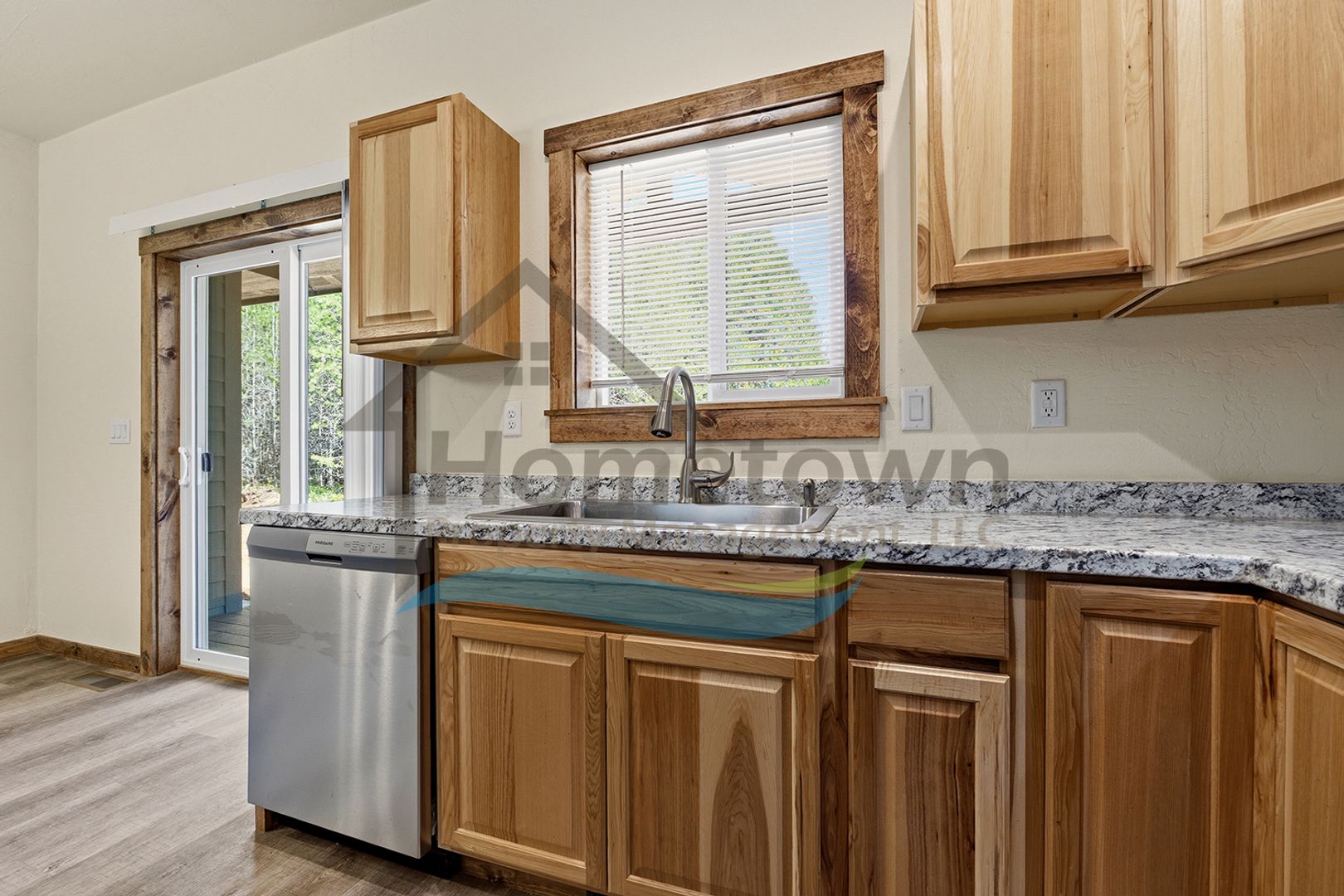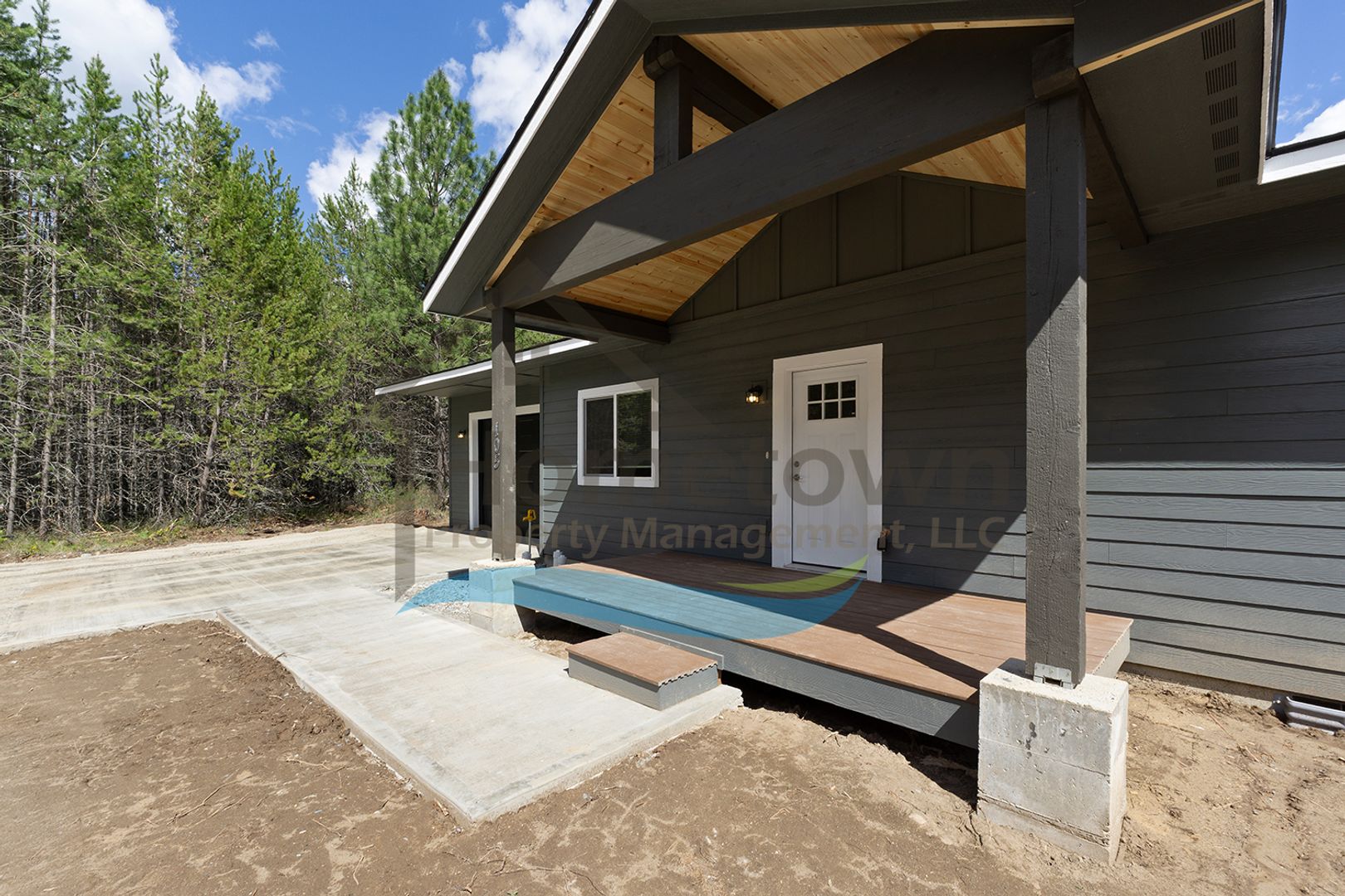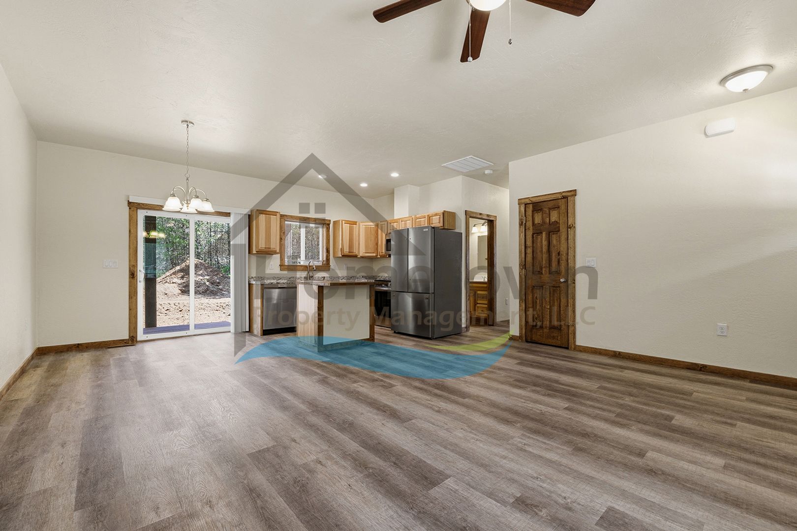Burnt Tree Lane is a rustic road taking you directly to the home's driveway. The front entrance sits on a deck large enough for a small set of outdoor furniture. The deck sits under a decorative canopy protecting you from the elements as you arrive. Upon initial entry, you step right into the home's living, dining, and kitchen combination open floor plan great room.