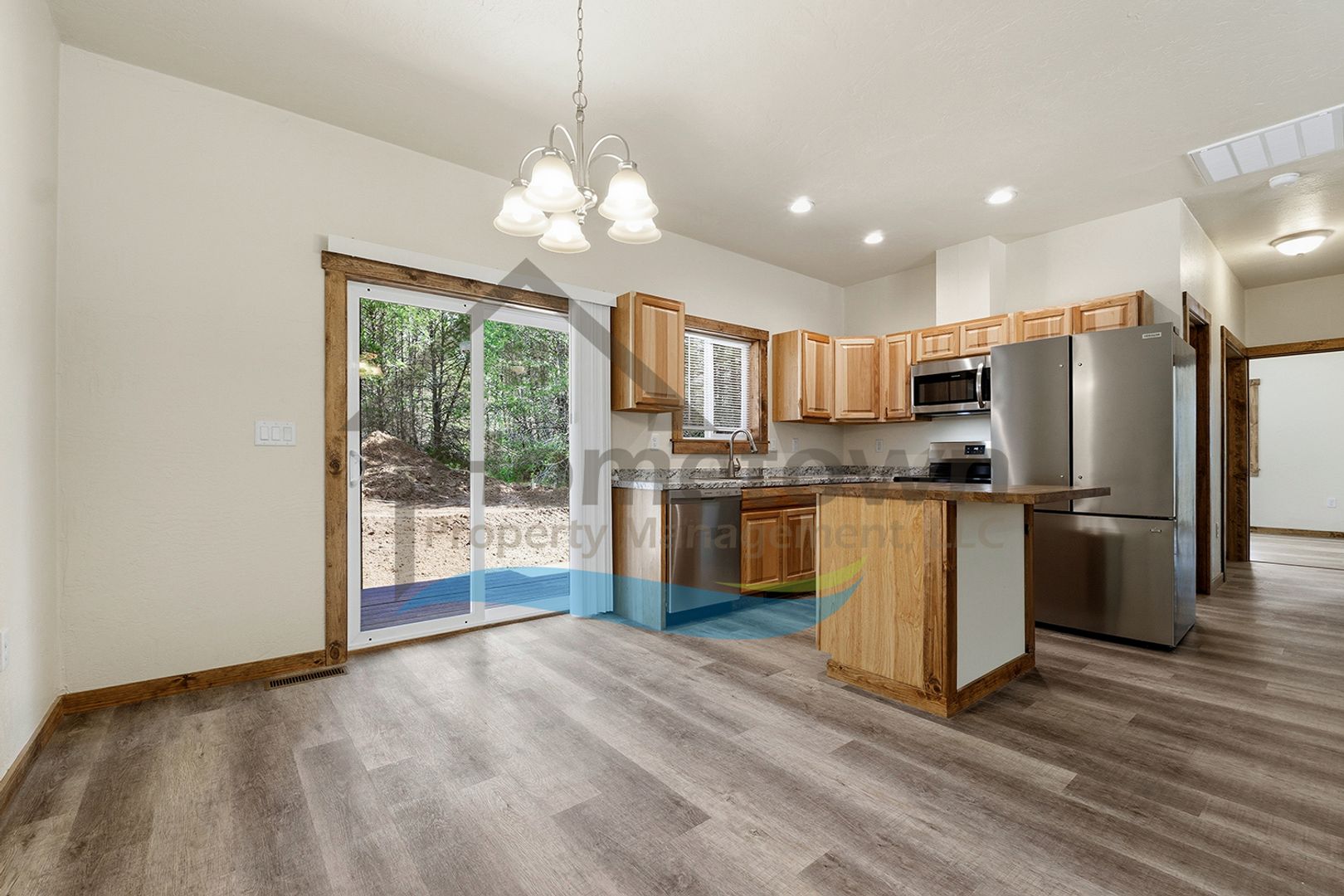 The sliding glass door in the dining area leads to a covered deck and to the home's back yard.
