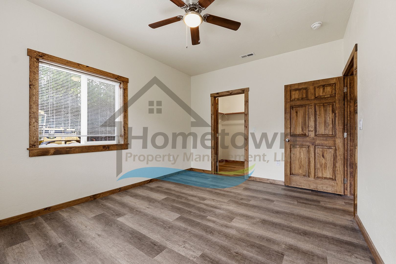 An adjacent hallway leads to the master bedroom, the guest bedroom, the bathroom, a linen closet, and the laundry nook. The master bedroom is the larger of the two bedrooms and looks out onto the home's back yard. The guest bedroom looks out onto the home's front yard and includes a ceiling fan light fixture. Both bedrooms have large, lighted walk-in closets.