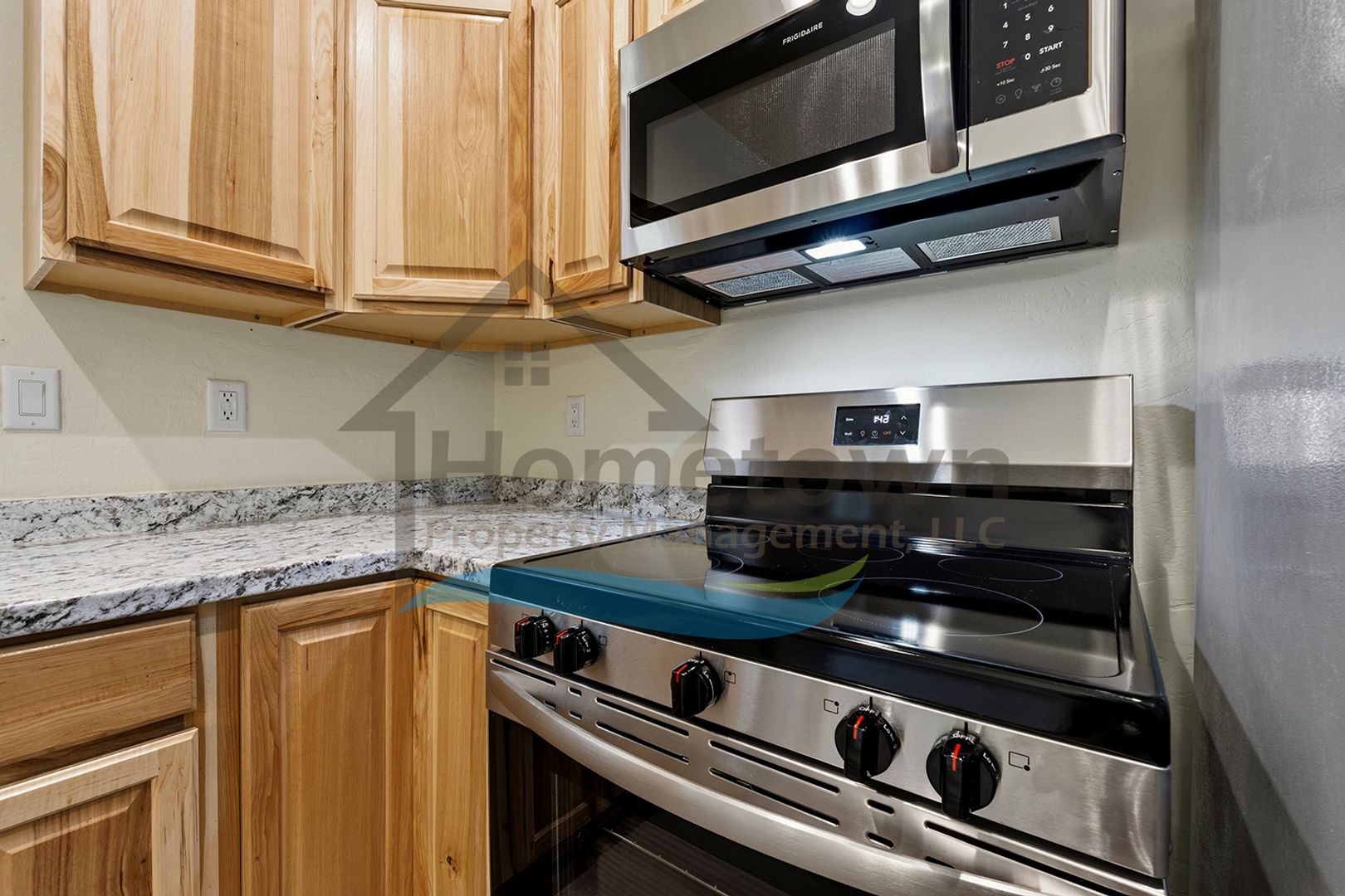 The kitchen starts with a kitchen island. This island has its own set of cupboards and a breakfast bar wide enough to accommodate two bar stools comfortably. The rest of the kitchen comes complete with granite countertops, a stainless steel deep sink, a large stainless steel refrigerator, a stainless steel electric stove and oven, a stainless steel built-in microwave, a stainless steel dishwasher, and rows of pine cabinetry above and below the counters.