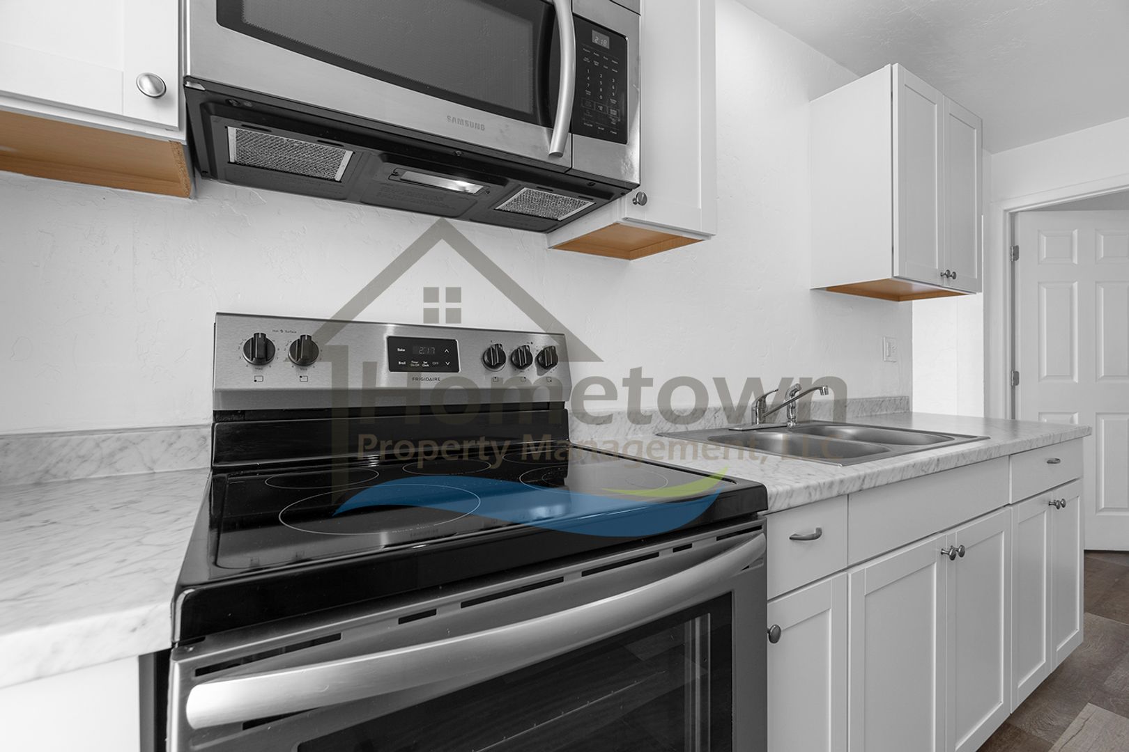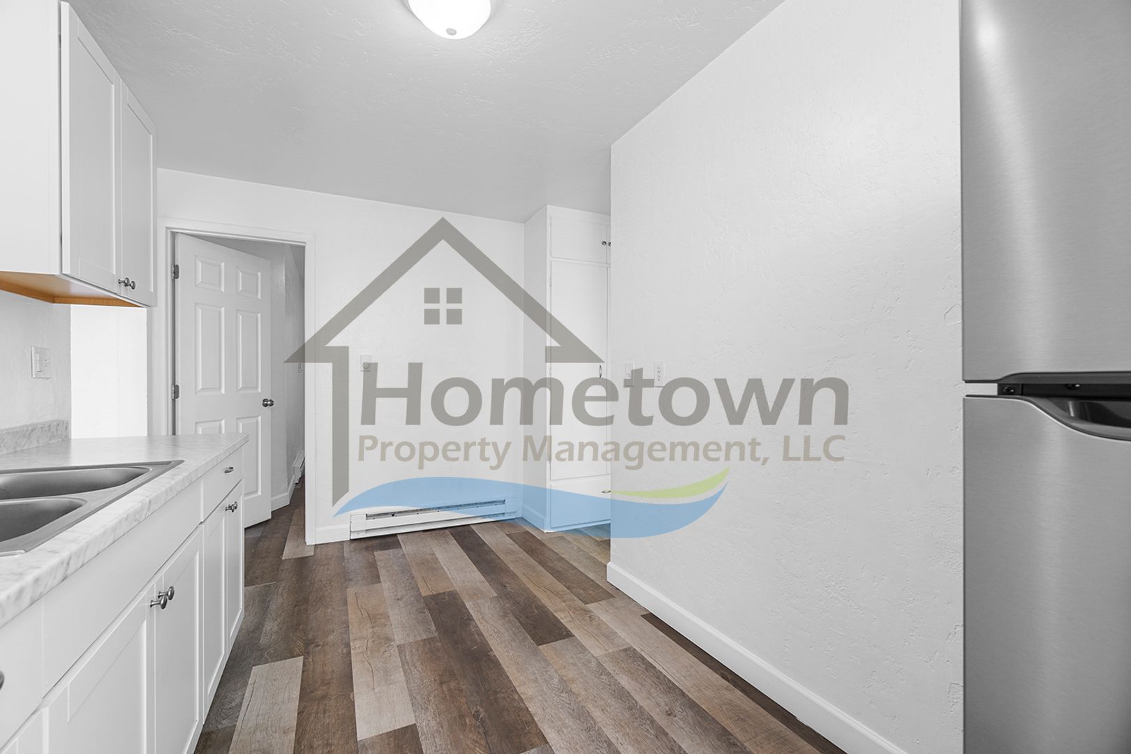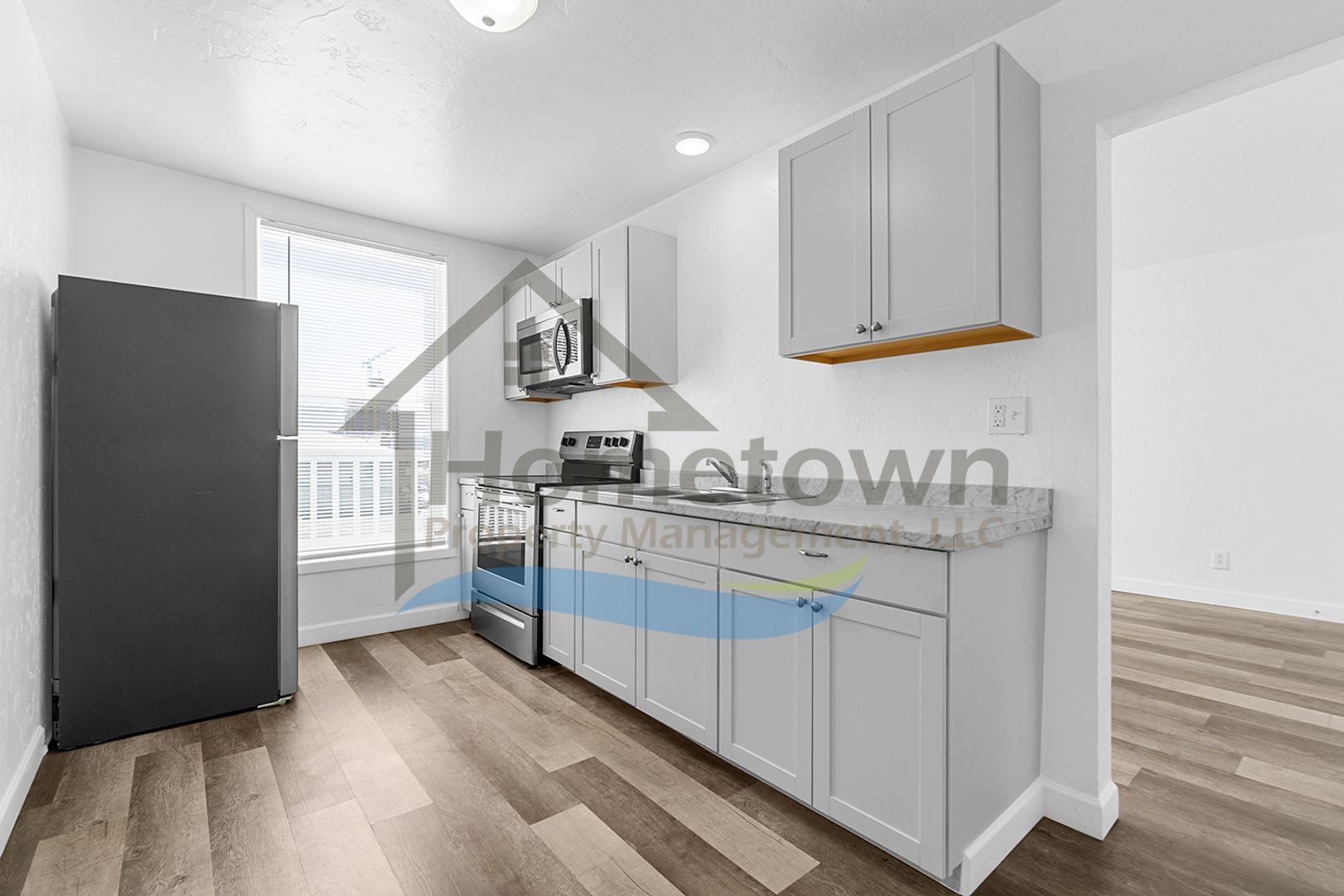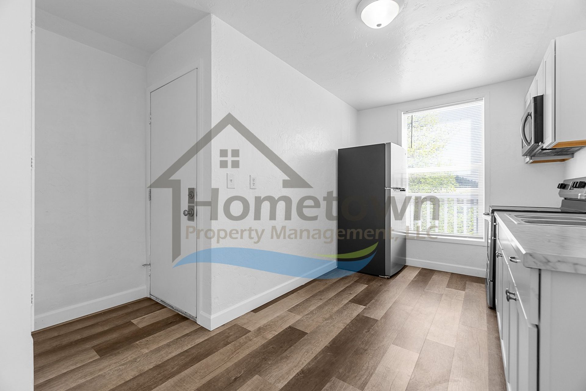 Upon initial entry, you step right into the home's kitchen. This kitchen comes with a large stainless steel refrigerator, a stainless steel electric stove and oven, a stainless steel built-in overhead microwave, a dual basin stainless steel sink, laminate countertops, and rows of white cabinetry above and below the counters. There is room to incorporate a small dining area either in the kitchen or in the living room. A large window brings a lot of natural light into the kitchen and offers a view of downtown Coeur d'Alene.