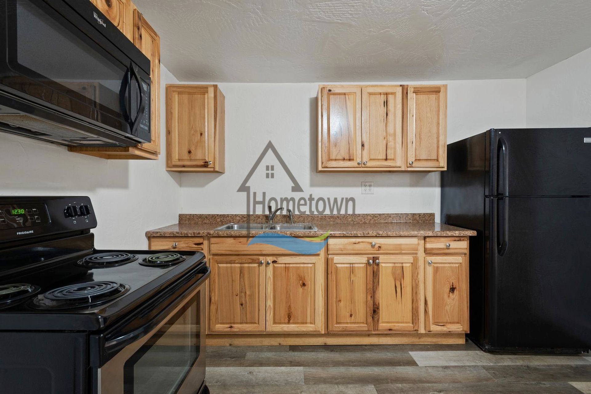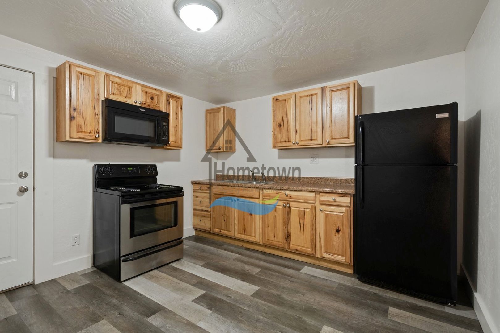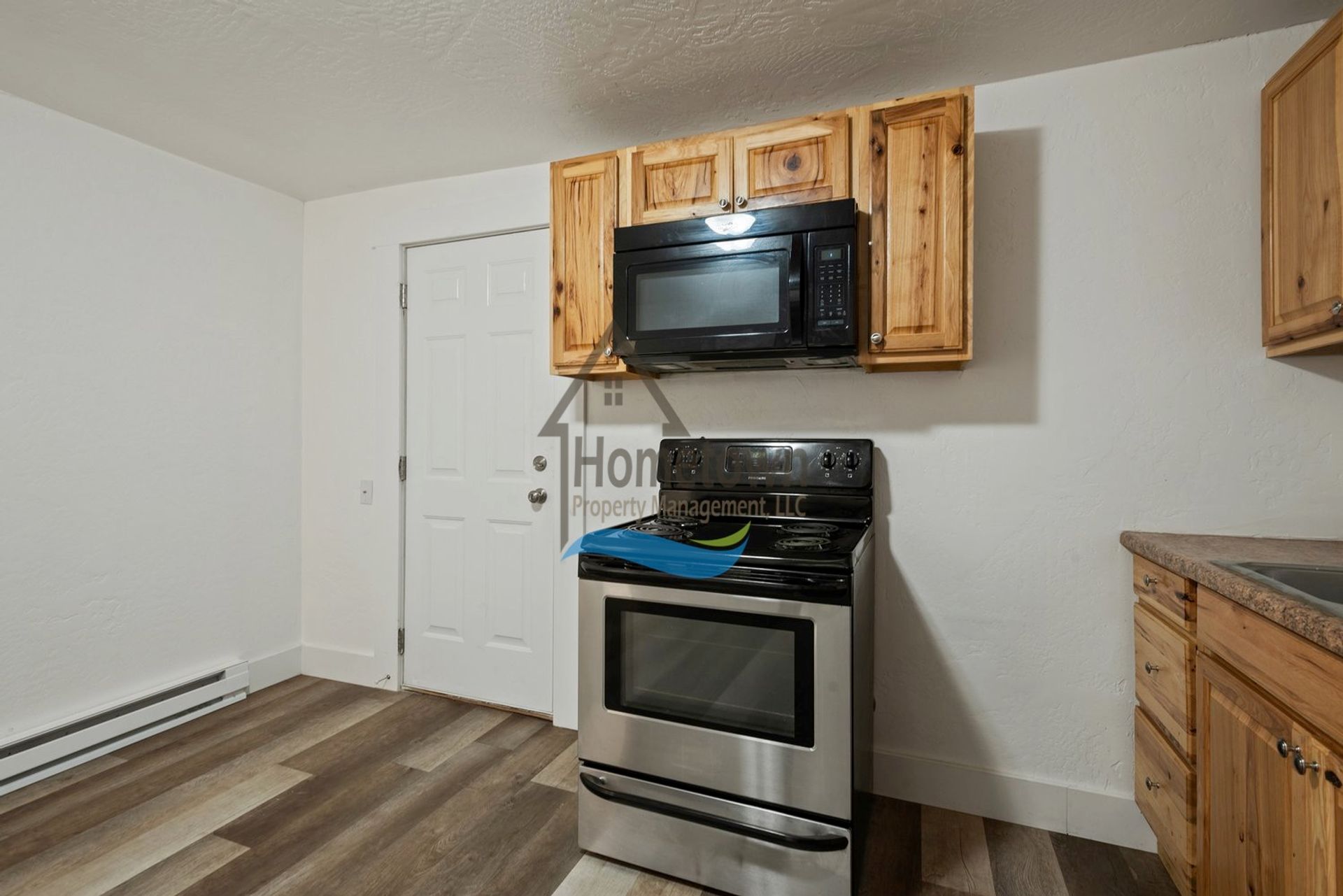 The kitchen is large enough to include a designated dining area. The kitchen includes a large refrigerator, a stainless steel electric stove and oven, a built-in overhead microwave, a stainless steel sink, laminate countertops, and new pinewood cabinets.