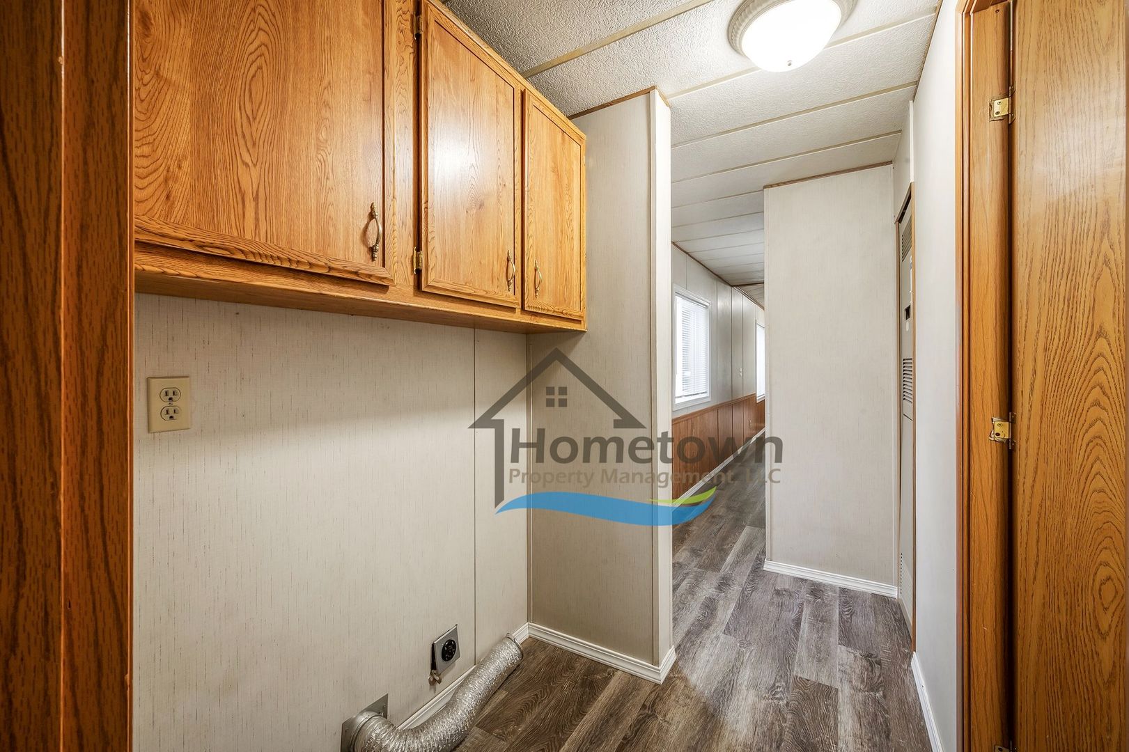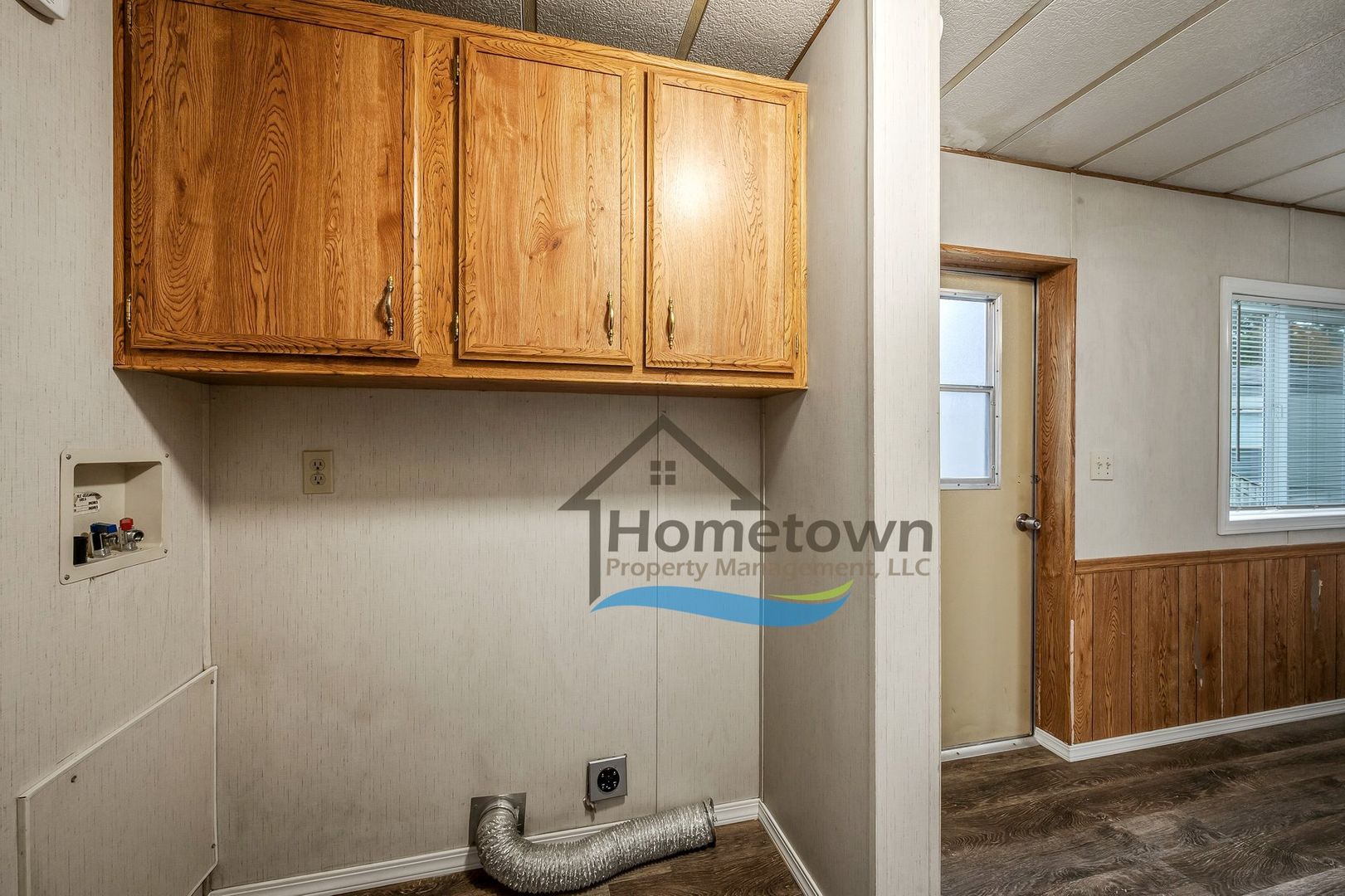 Just outside the bathroom is a laundry nook with washer and dryer hookups and a row of storage cupboards overhead. Immediately adjacent is the home's back entrance leading to the back yard. This entrance has its own porch.