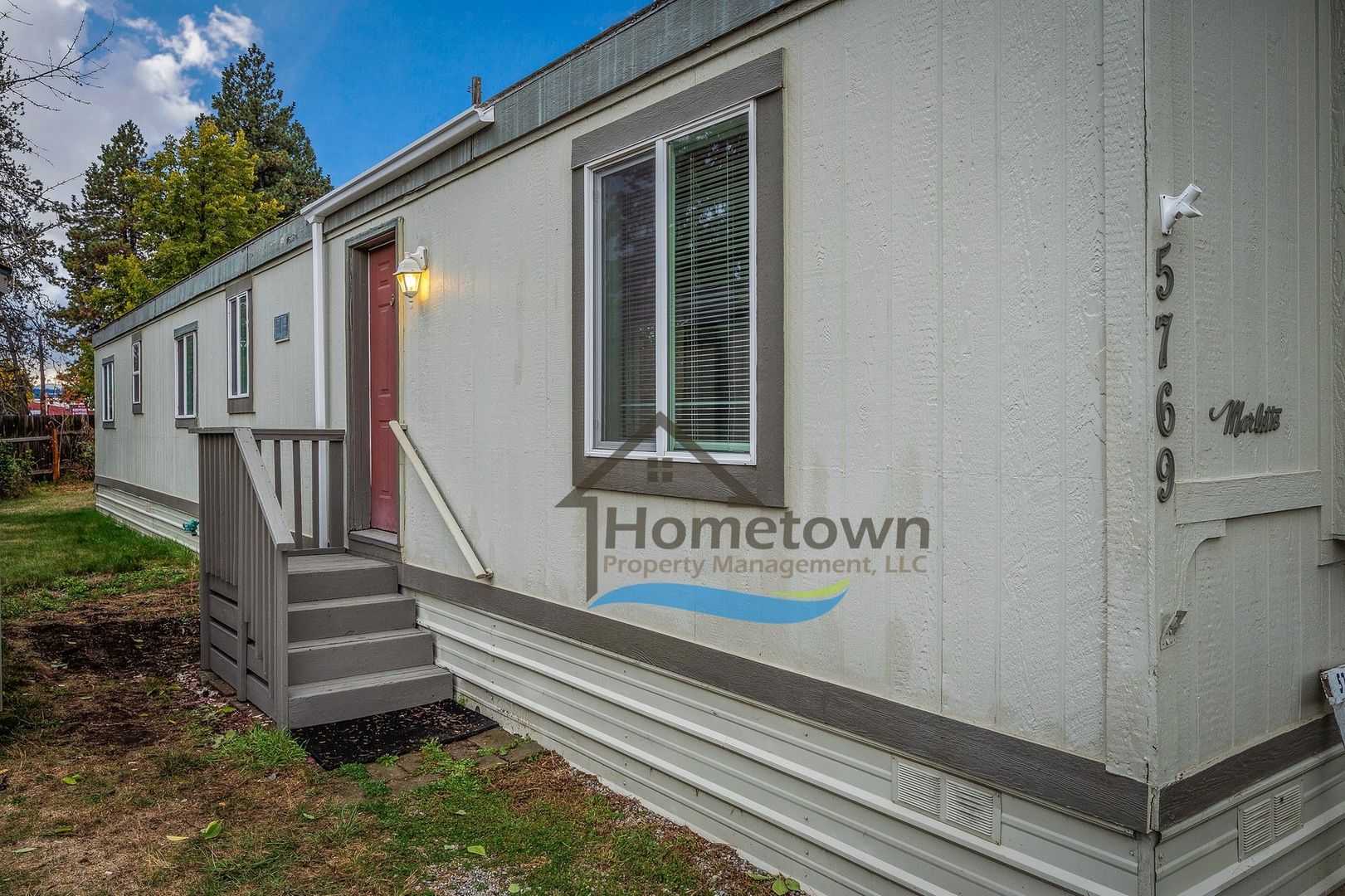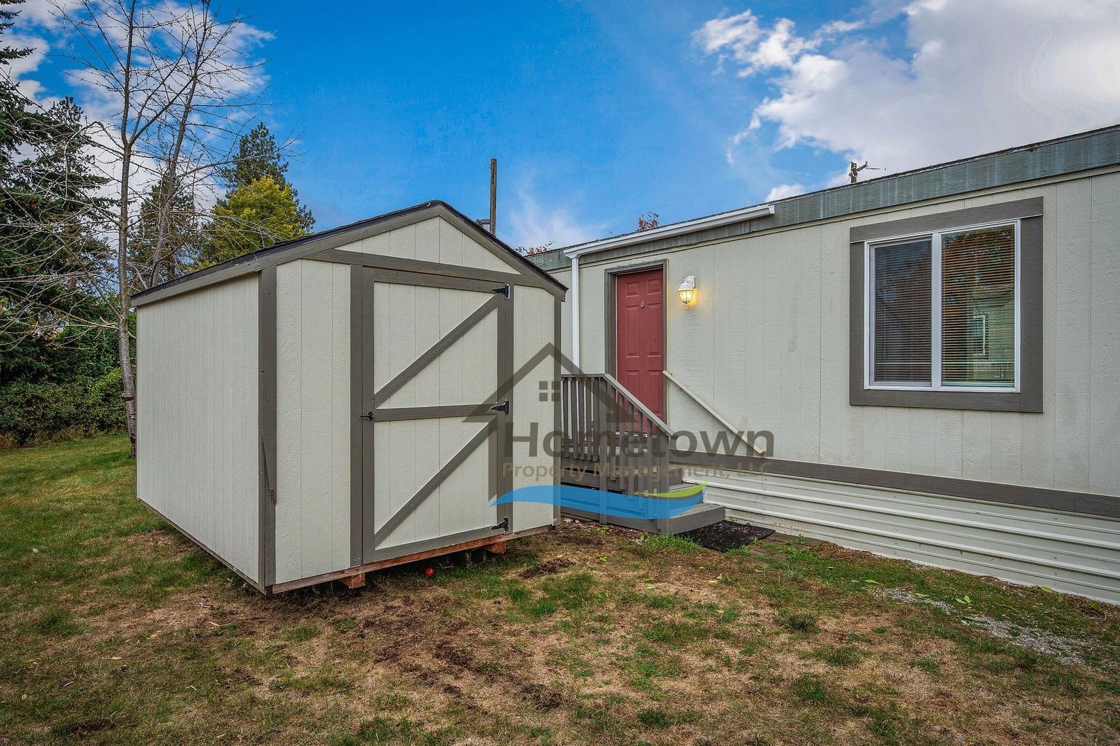 The home is surrounded by a green grassy yard. Parking is immediately in front of the home close to the front door. An outdoor lockable storage shed is available for tenants to use.