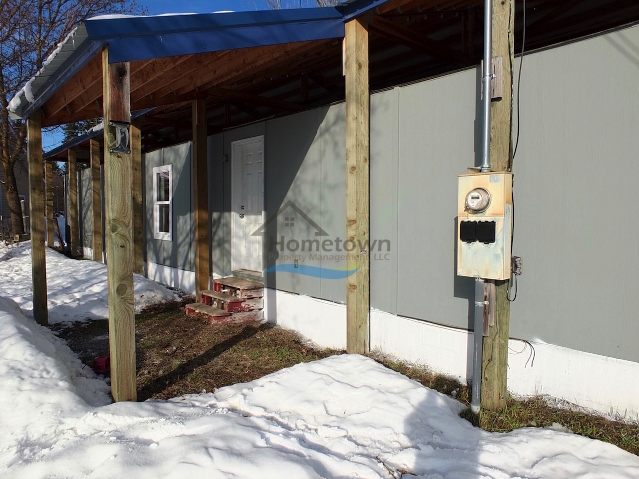 There is a heavy duty metal snow roof built over the home protecting it from the elements and extends outward providing a covered porch at the entry.