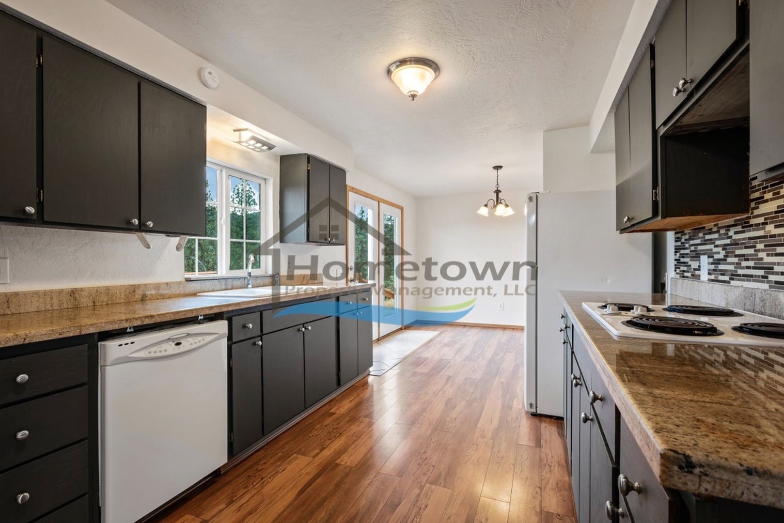 Kitchen amenities include granite countertops, a tile backsplash, painted cabinets, a wall oven, range, dishwasher, and refrigerator.