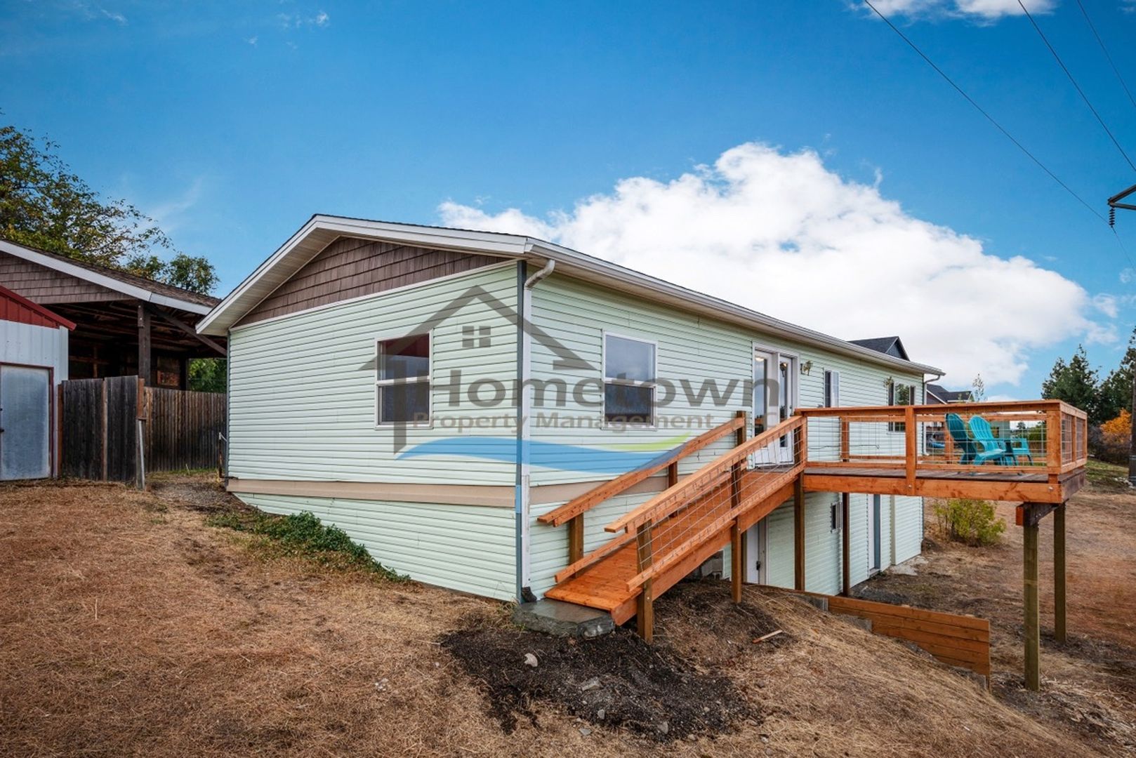 The entry leads into a large living room with a great big window facing the river. The kitchen and dining area have laminate flooring and double doors that lead out onto the elevated deck.