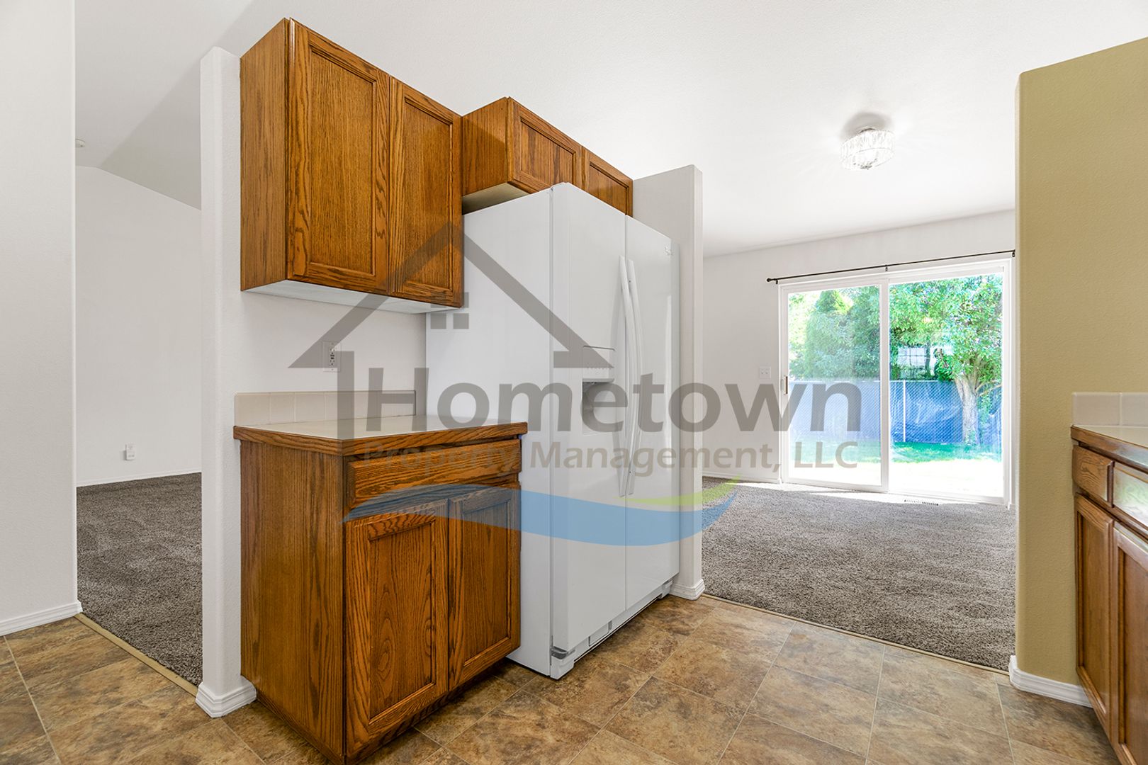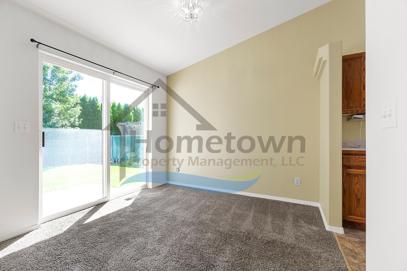 The sliding glass door in the dining room leads to a patio and to the home's back yard. This yard is fully fenced, making it an ideal location for family gatherings, for pets, and for children to play in. There is a shed in the back yard available for outdoor storage.