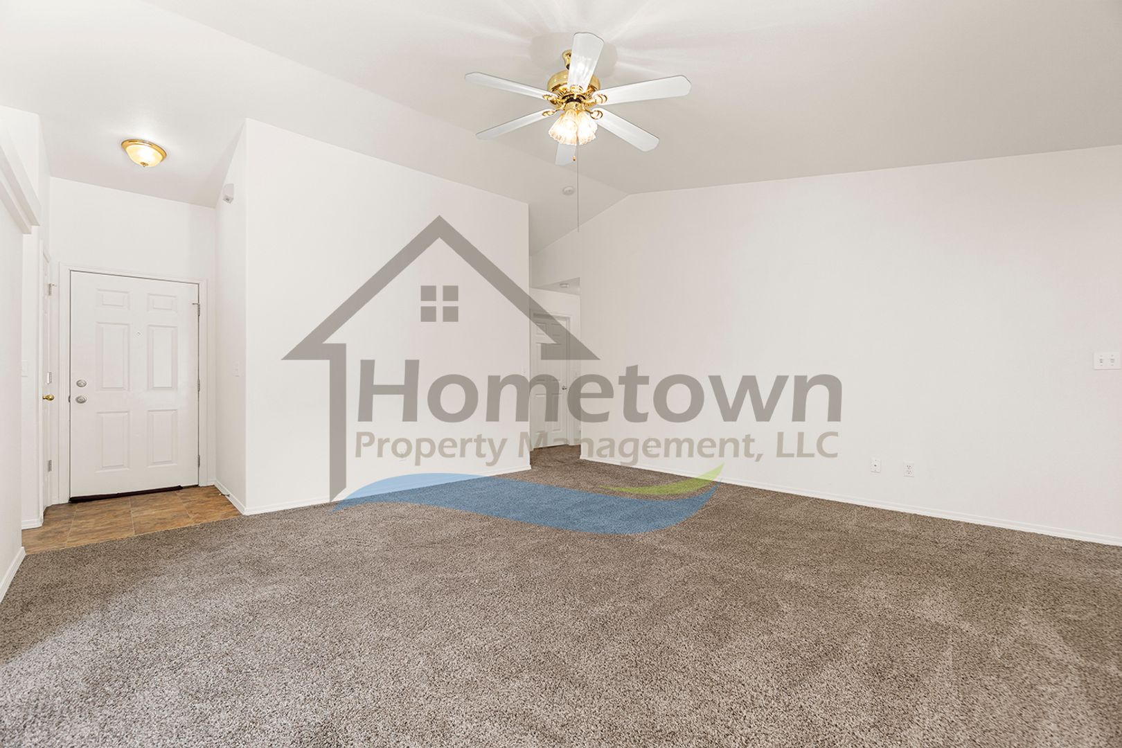 The home has its own driveway leading up to the garage. The front door of the home sits under a covered front porch large enough for a small set of patio furniture. Upon initial entry, you step right into the home's living room with a vaulted ceiling and a ceiling fan light fixture. A large picture window and a sliding glass door facing the east bring an abundance of natural light into the room. A coat closet is immediately available on your right.