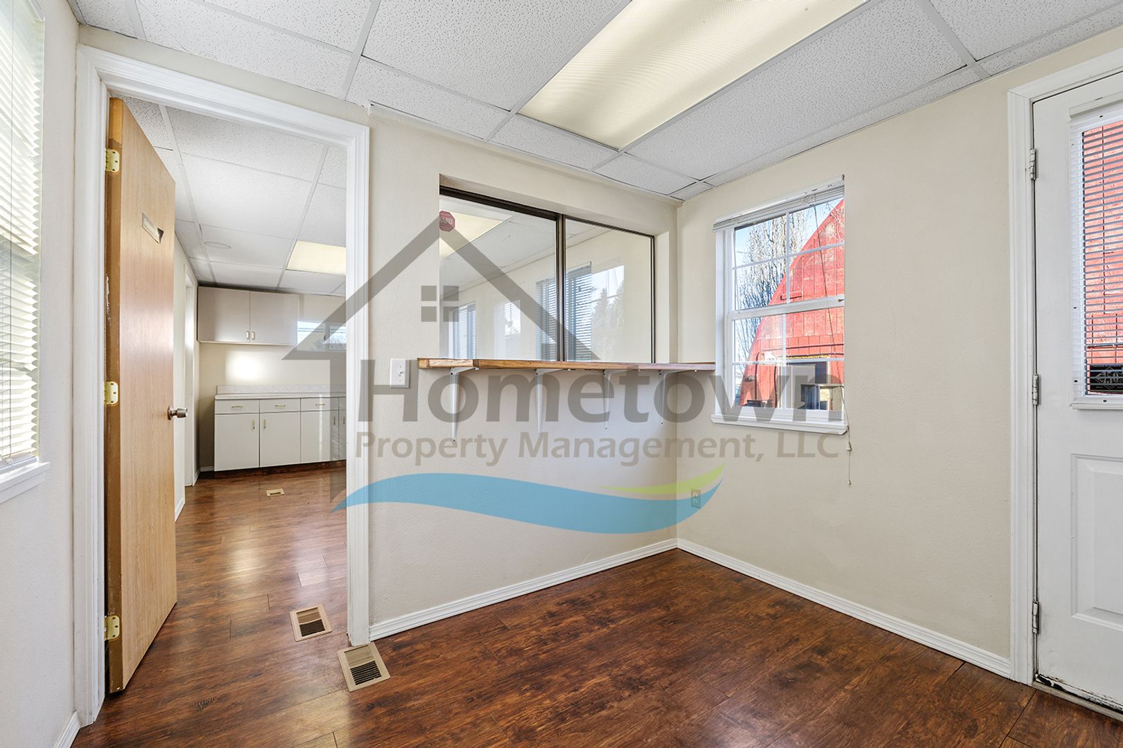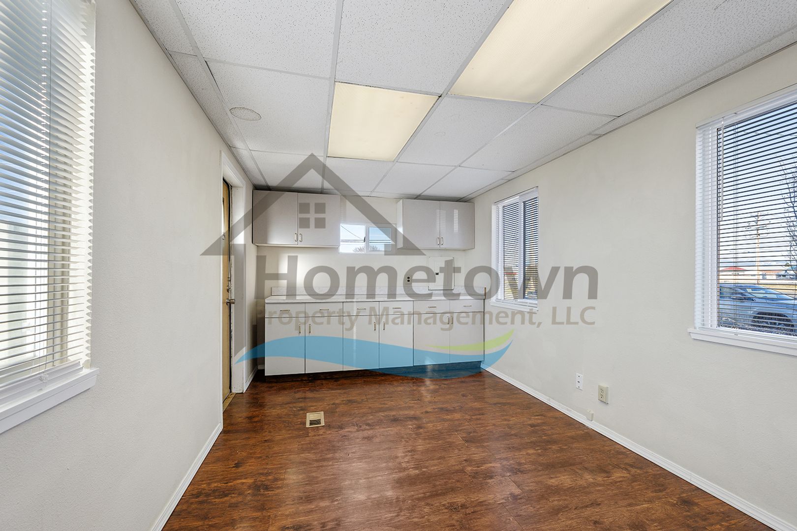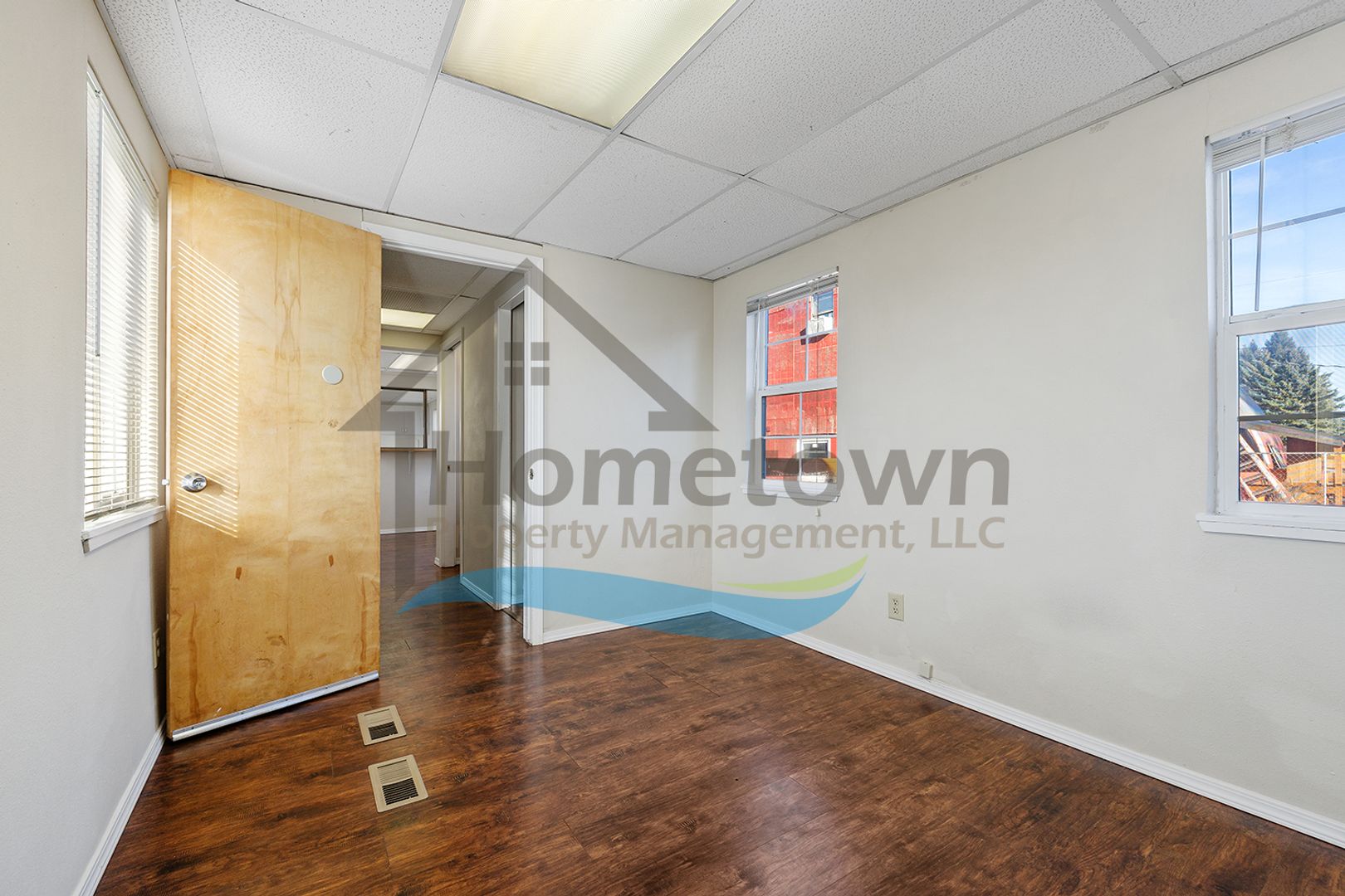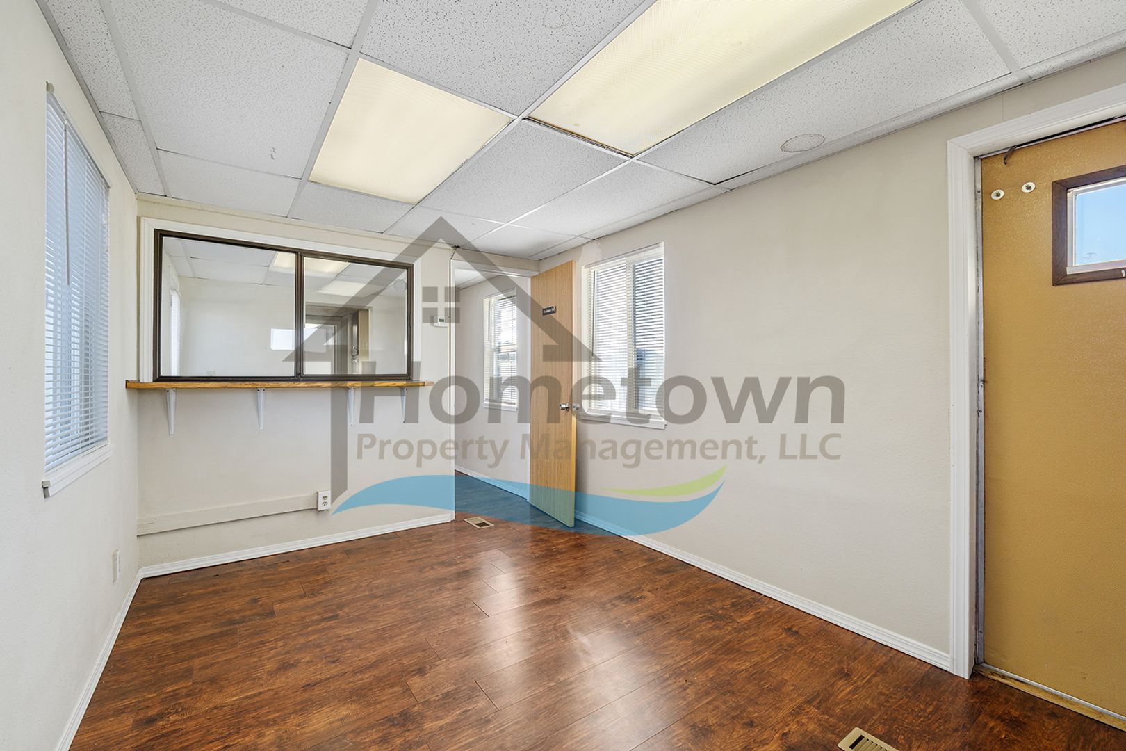 Windows on both sides of the building bring a lot of natural light into the offices. Floors throughout the building are laminate flooring. All of the windows are vinyl and come with venetian blinds installed.