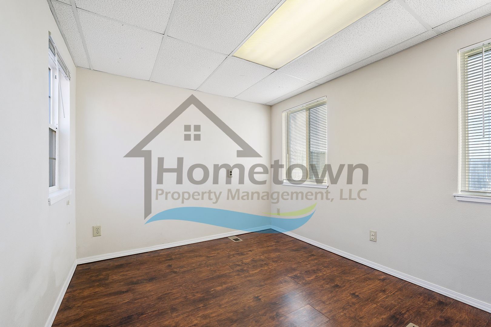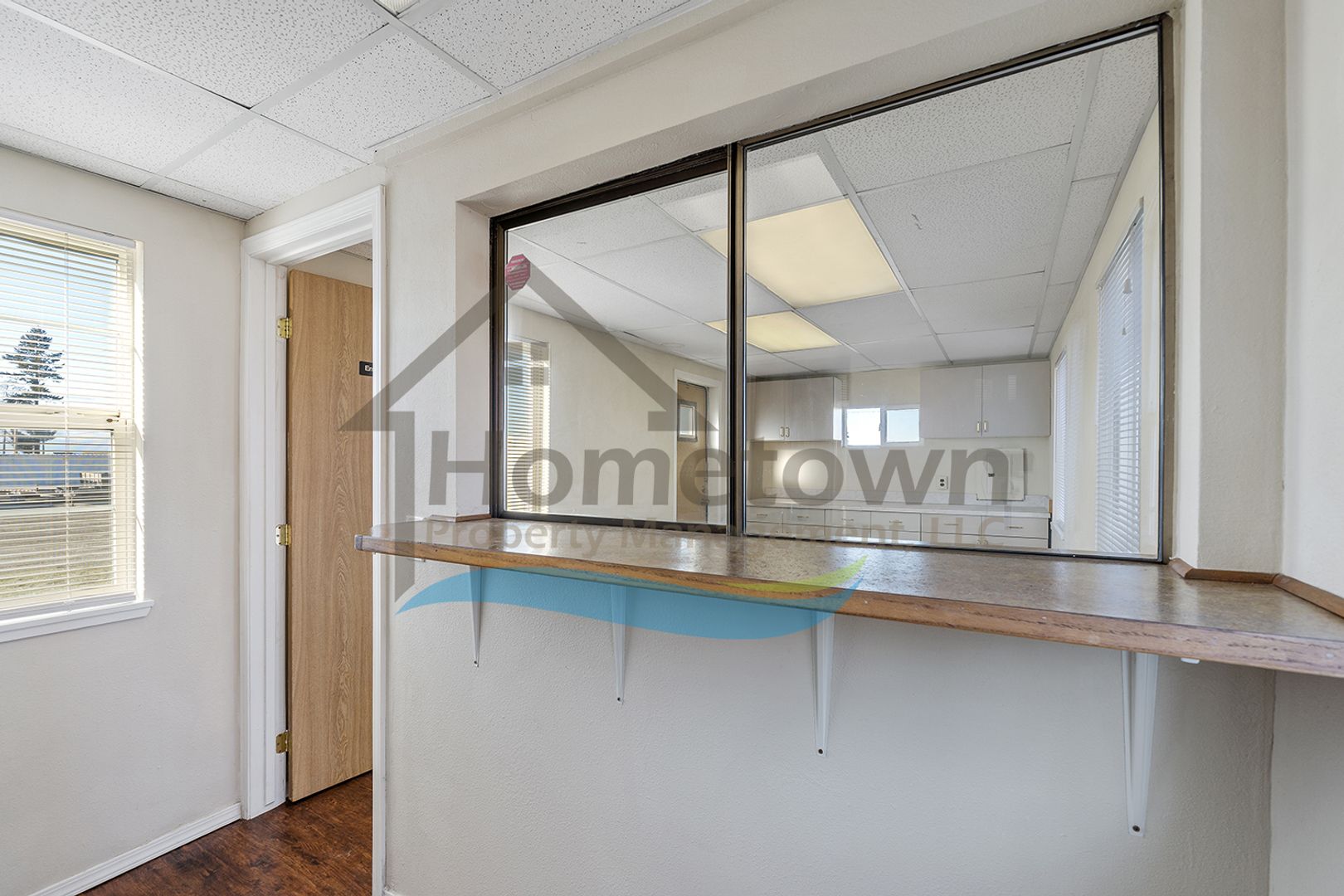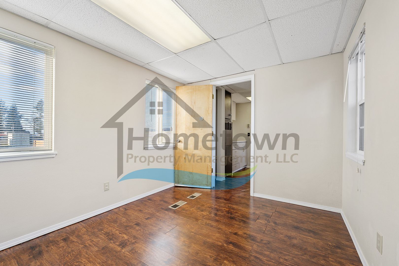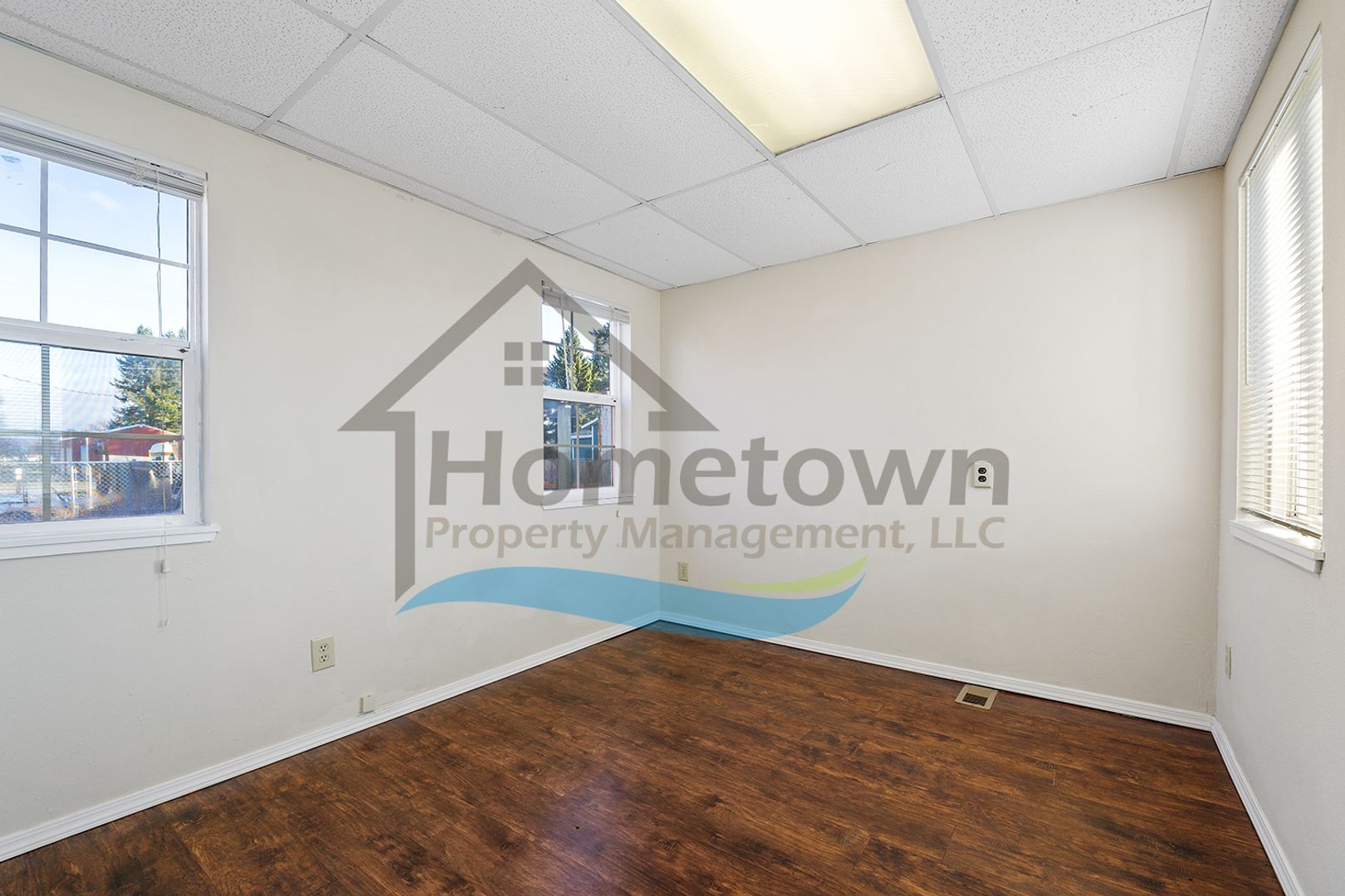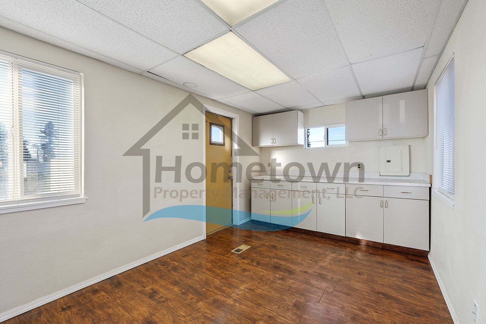 Windows on both sides of the building bring a lot of natural light into the offices. Floors throughout the building are laminate flooring. All of the windows are vinyl and come with venetian blinds installed.