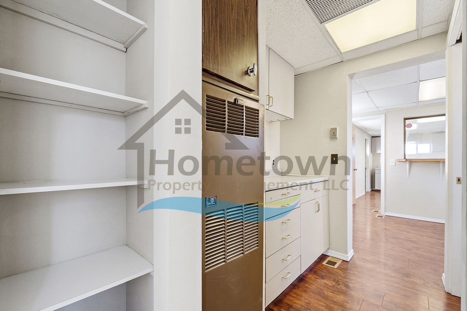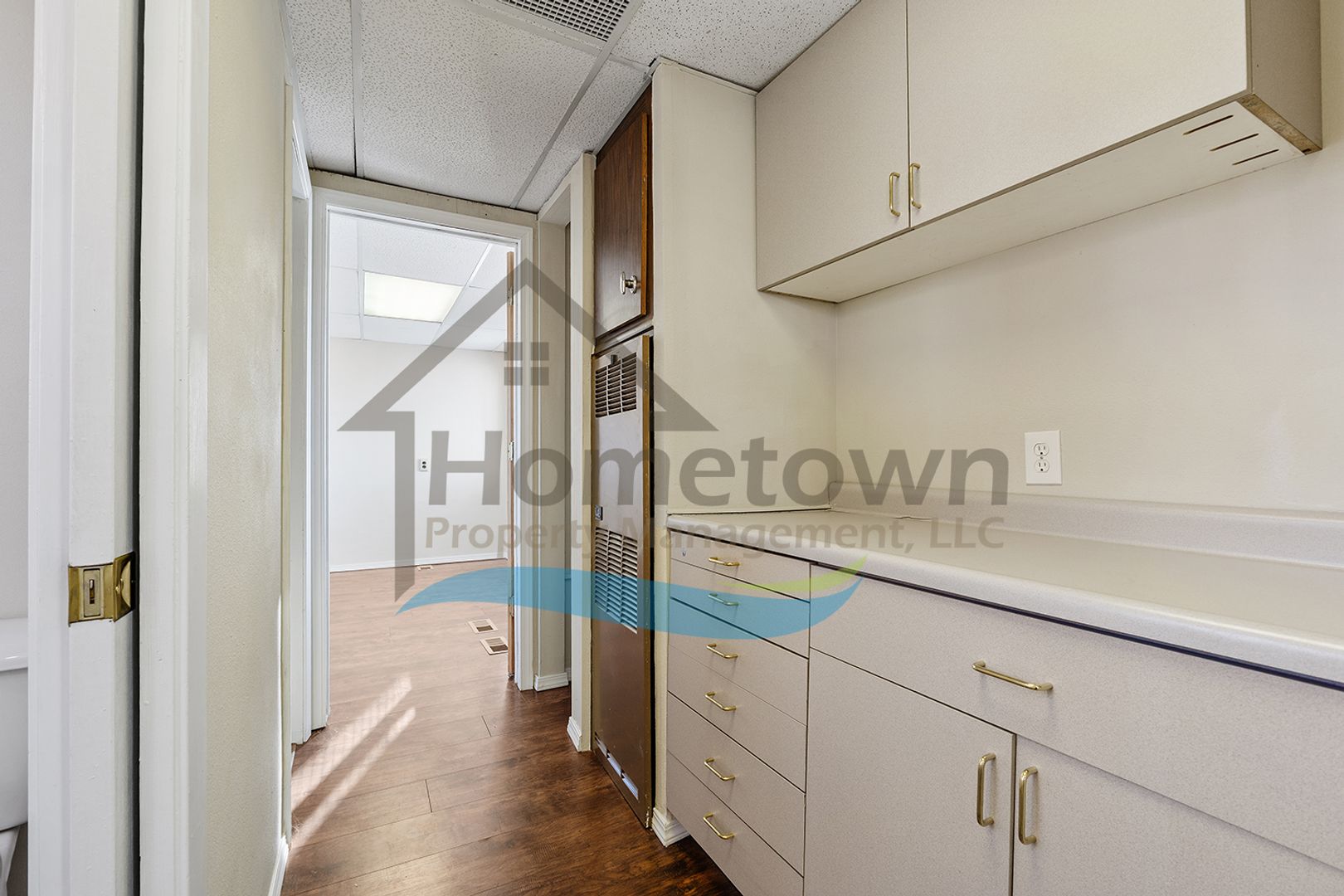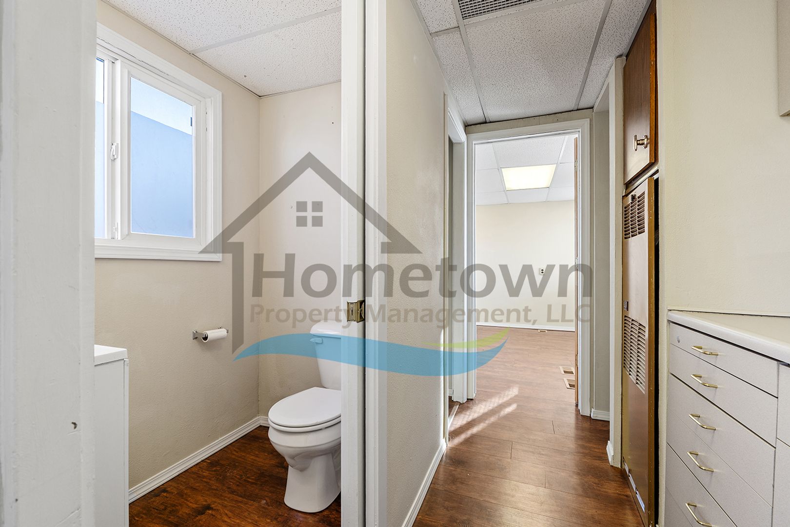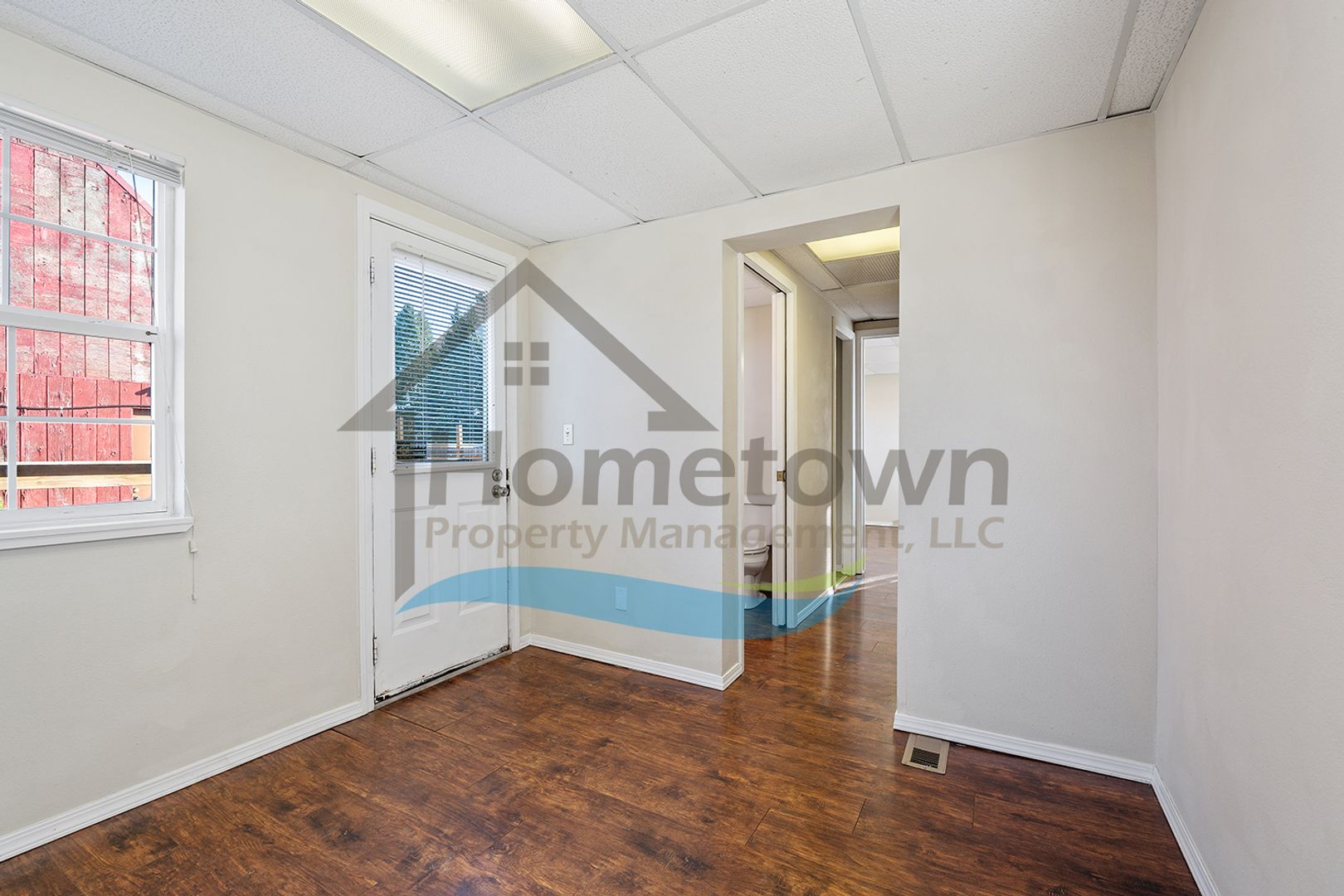 Windows on both sides of the building bring a lot of natural light into the offices. Floors throughout the building are laminate flooring. All of the windows are vinyl and come with venetian blinds installed.