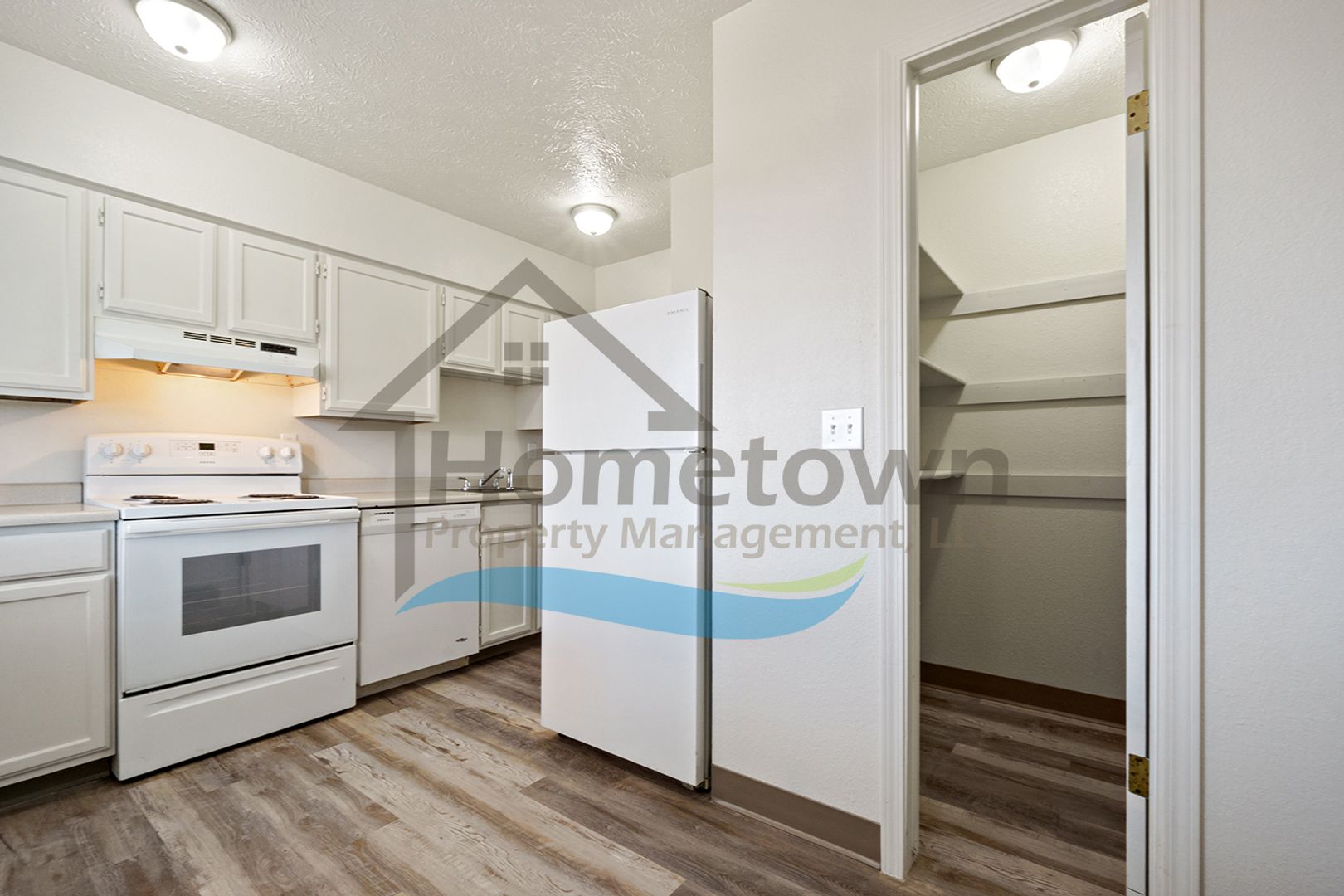 The kitchen is immediately adjacent. This kitchen comes fully appointed with a large refrigerator, an electric range and oven, a dishwasher, a stainless steel sink with a spray nozzle, laminate counters, a row of cupboards and drawers below the counter, and another row of cupboards overhead. Immediately connected is a dining area and a walk-in pantry with built-in shelving.