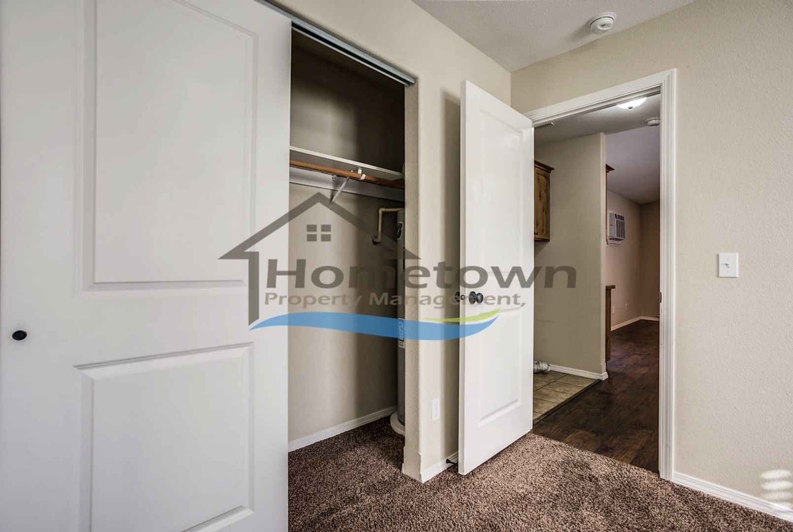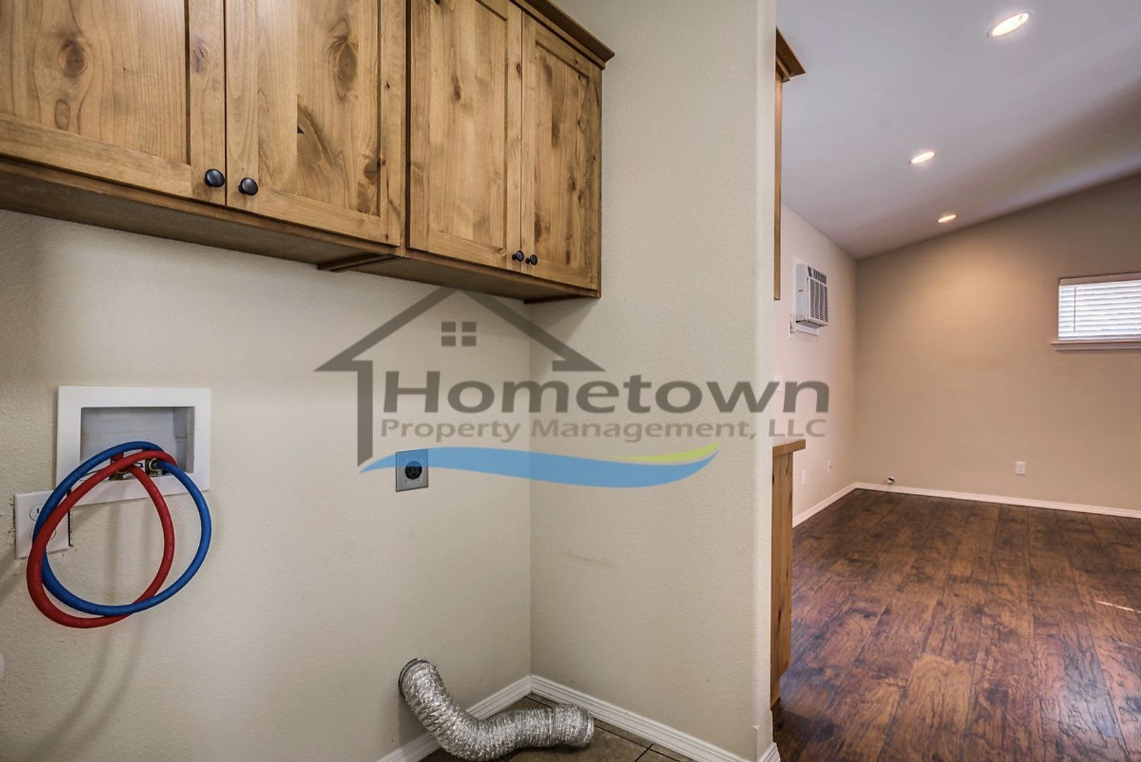 Washer and dryer hookups in the laundry area. Tub/shower combo in bathroom with tile floors and dark bronze fixtures.