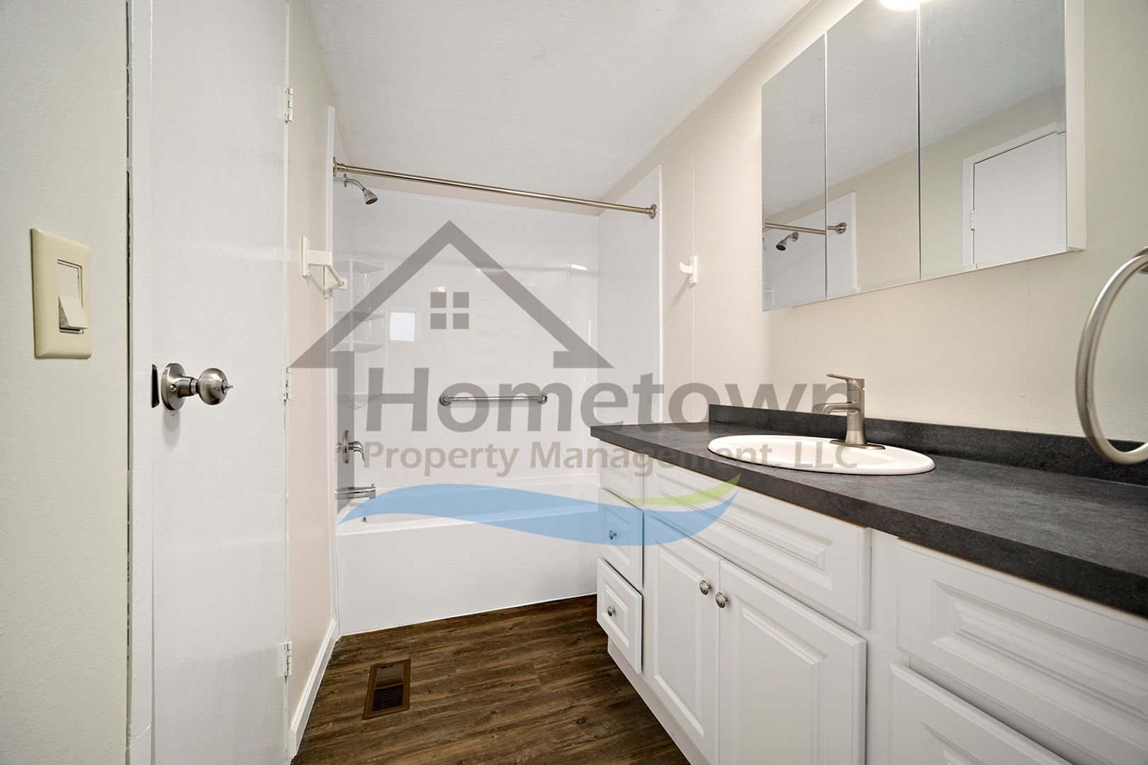 Immediately beyond the kitchen is the entrance into the master bedroom. This extra spacious bedroom has a its own bathroom and a wide closet. The master bathroom is a full bath with a tub and shower, a mirrored medicine cabinet, and a large sink vanity with cupboards and drawers.