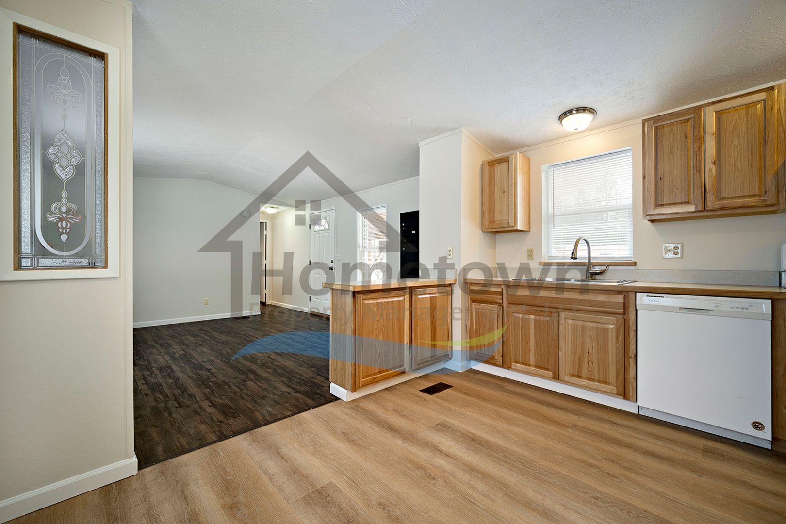 Floors in the bedrooms, living room, and bathrooms are luxury vinyl plank flooring. The kitchen features laminate flooring. All windows come with venetian blinds pre-installed. Heat in the home is provided by a forced air gas furnace.