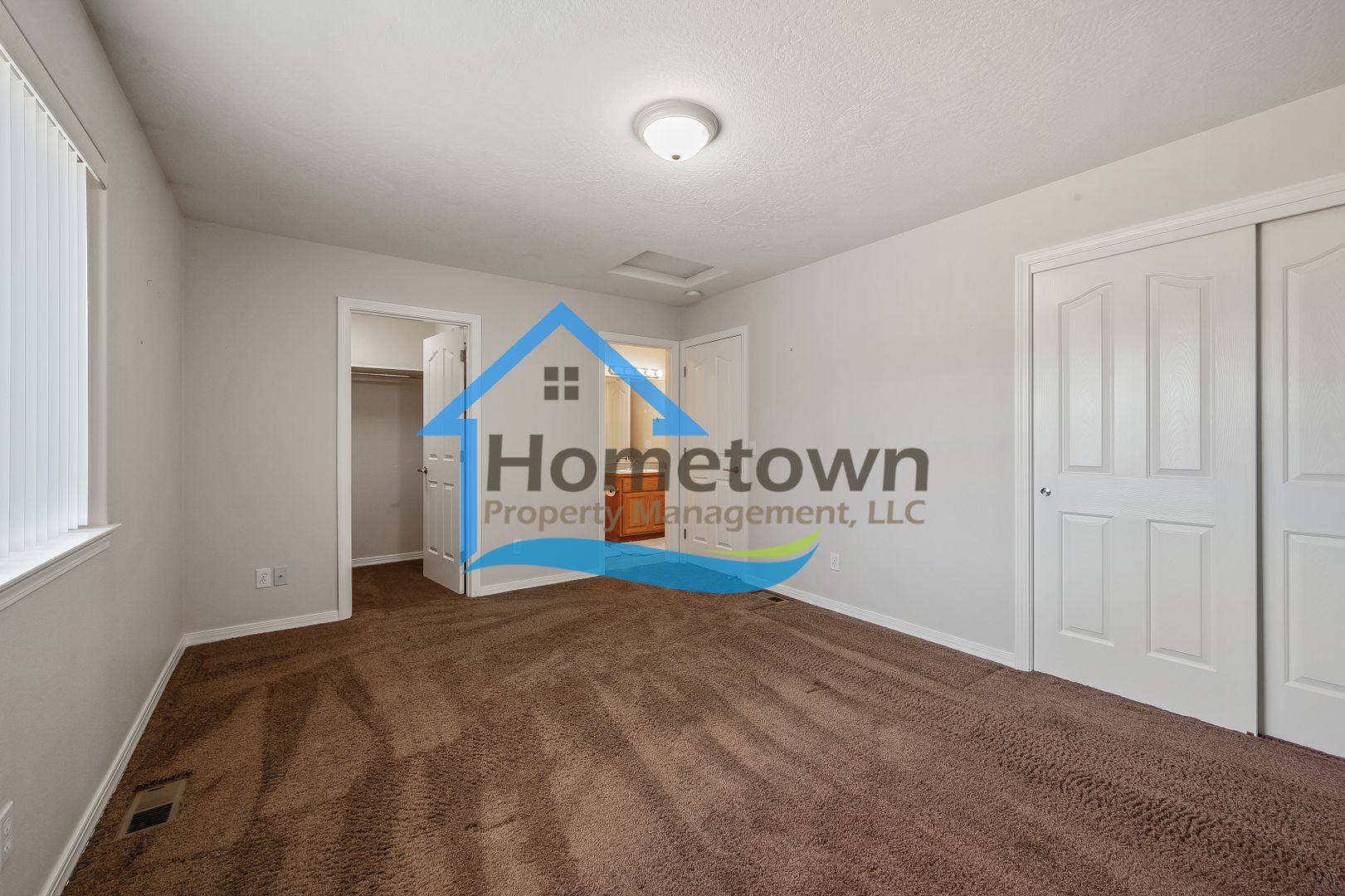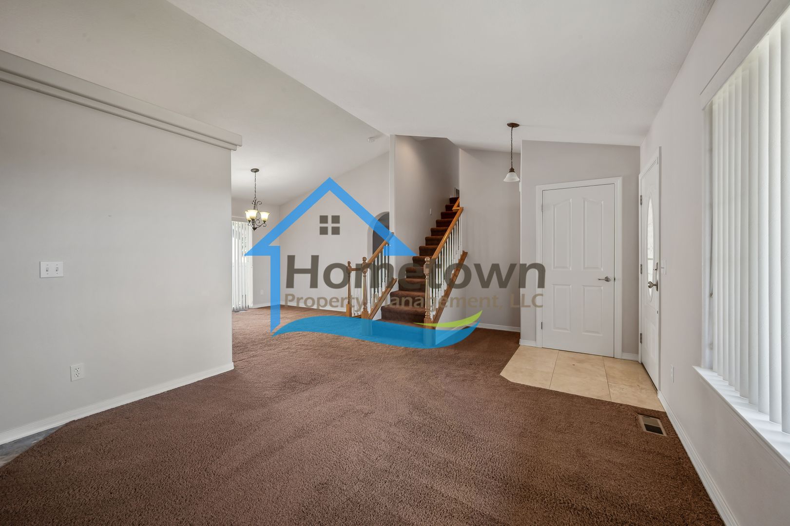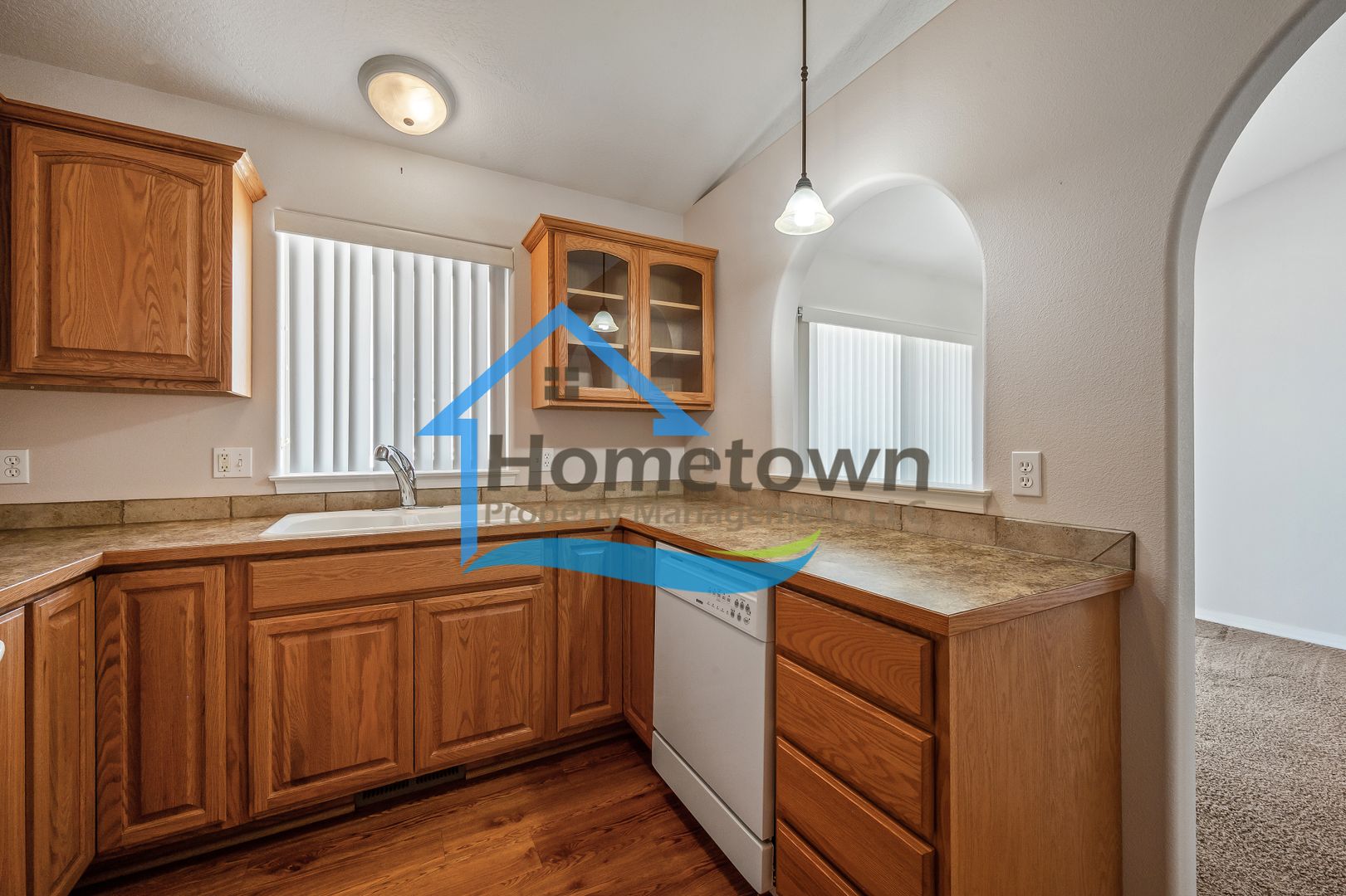 The fully enclosed backyard is accessible through the dining room's sliding glass door, providing a private space for outdoor gatherings and play. The attached two-car garage includes an additional entrance leading directly into the family room. The home is equipped with LED lighting for energy efficiency and a warm ambiance. Blinds are installed on all windows. The bedrooms and living areas are carpeted, while the bathrooms have tile flooring and the kitchen features laminate flooring. Climate control includes central air conditioning and a forced air gas furnace. An automatic sprinkler system is installed, with controls located in the garage.