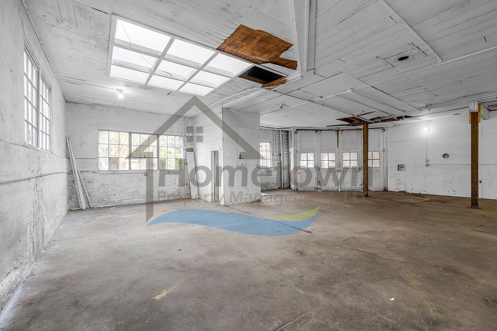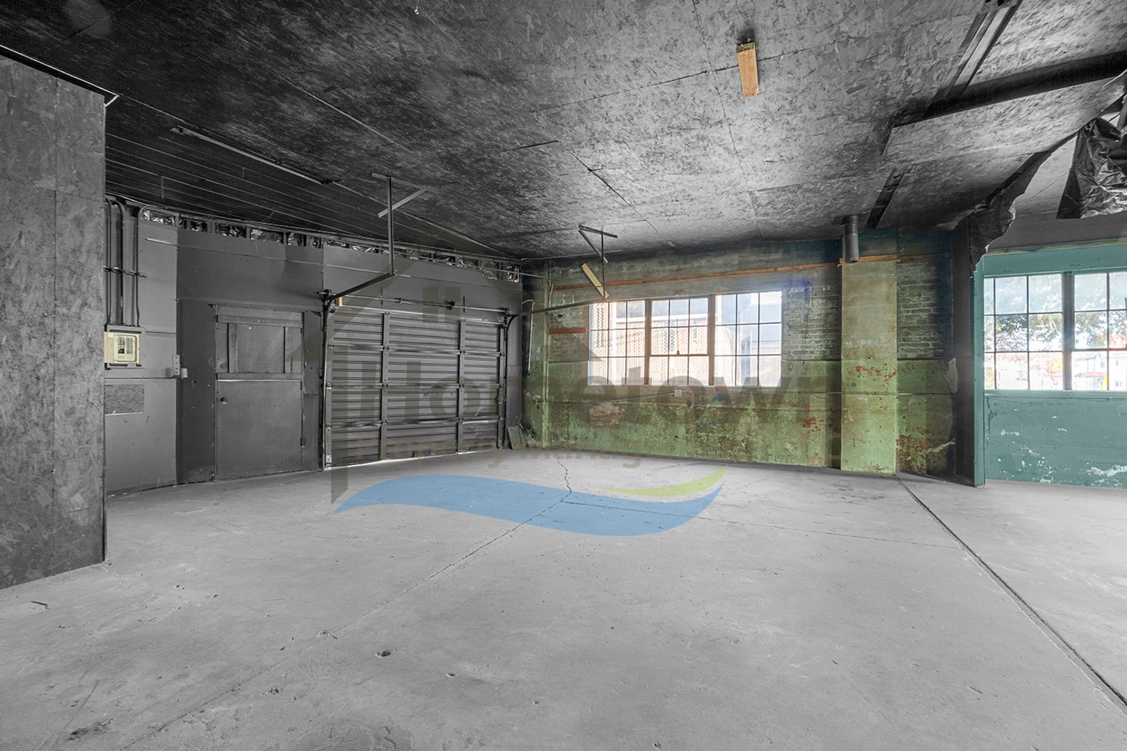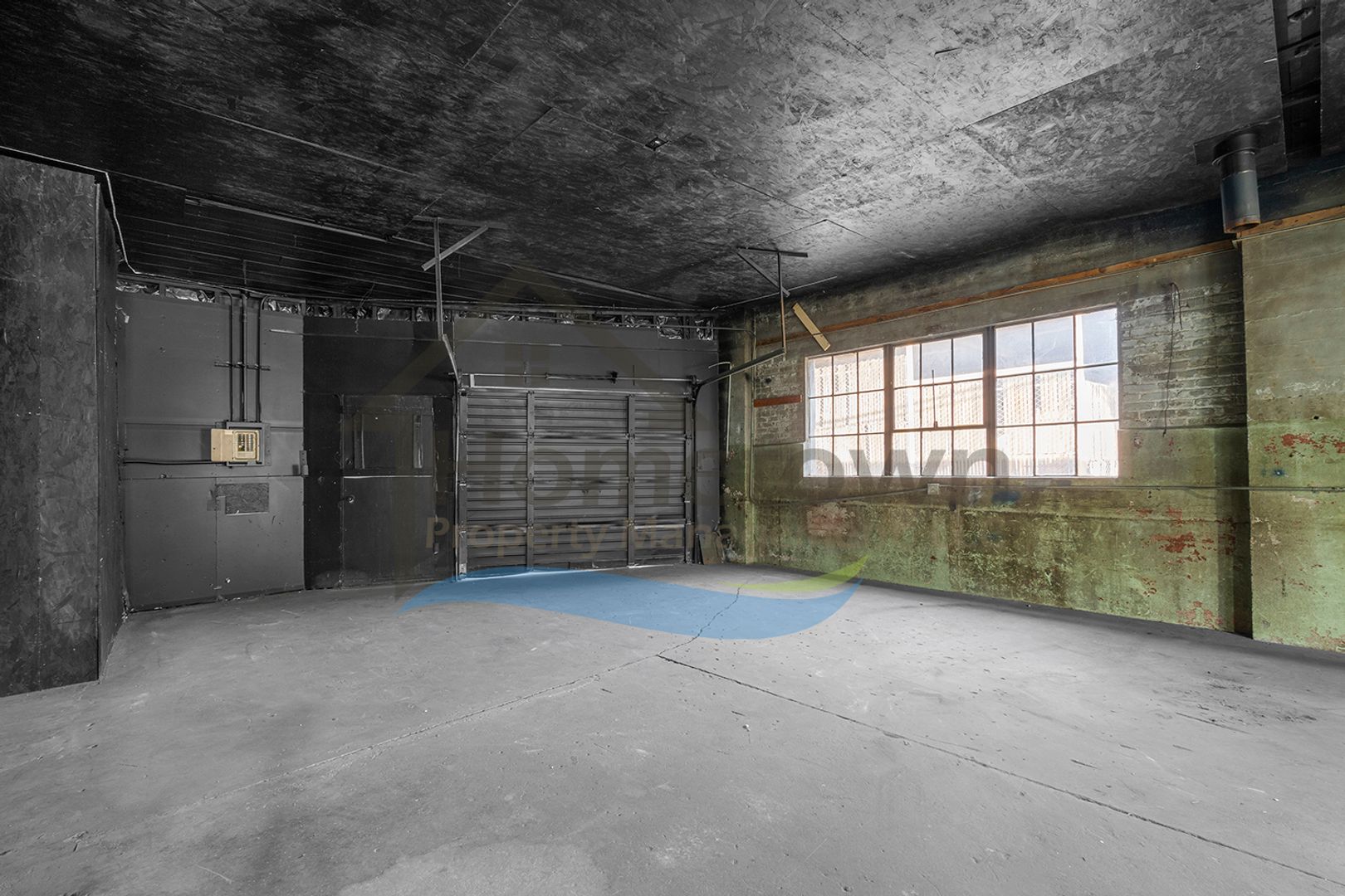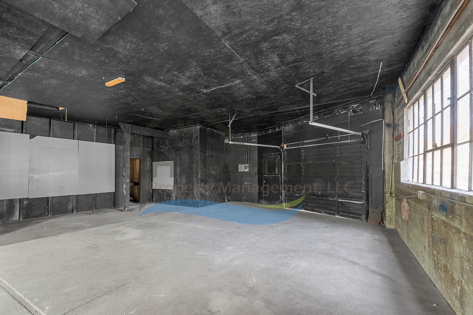 Unit B has its own personal door and a set of folding vertical garage doors which also open wide enough to allow large deliveries or small vehicles to be brought directly into the unit. Both of these doors are accessed through the alleyway adjacent to the building. This unit also has its own half bathroom, a storage room, rows of very large windows, and a skylight. These windows bring lots of natural light into the work space.