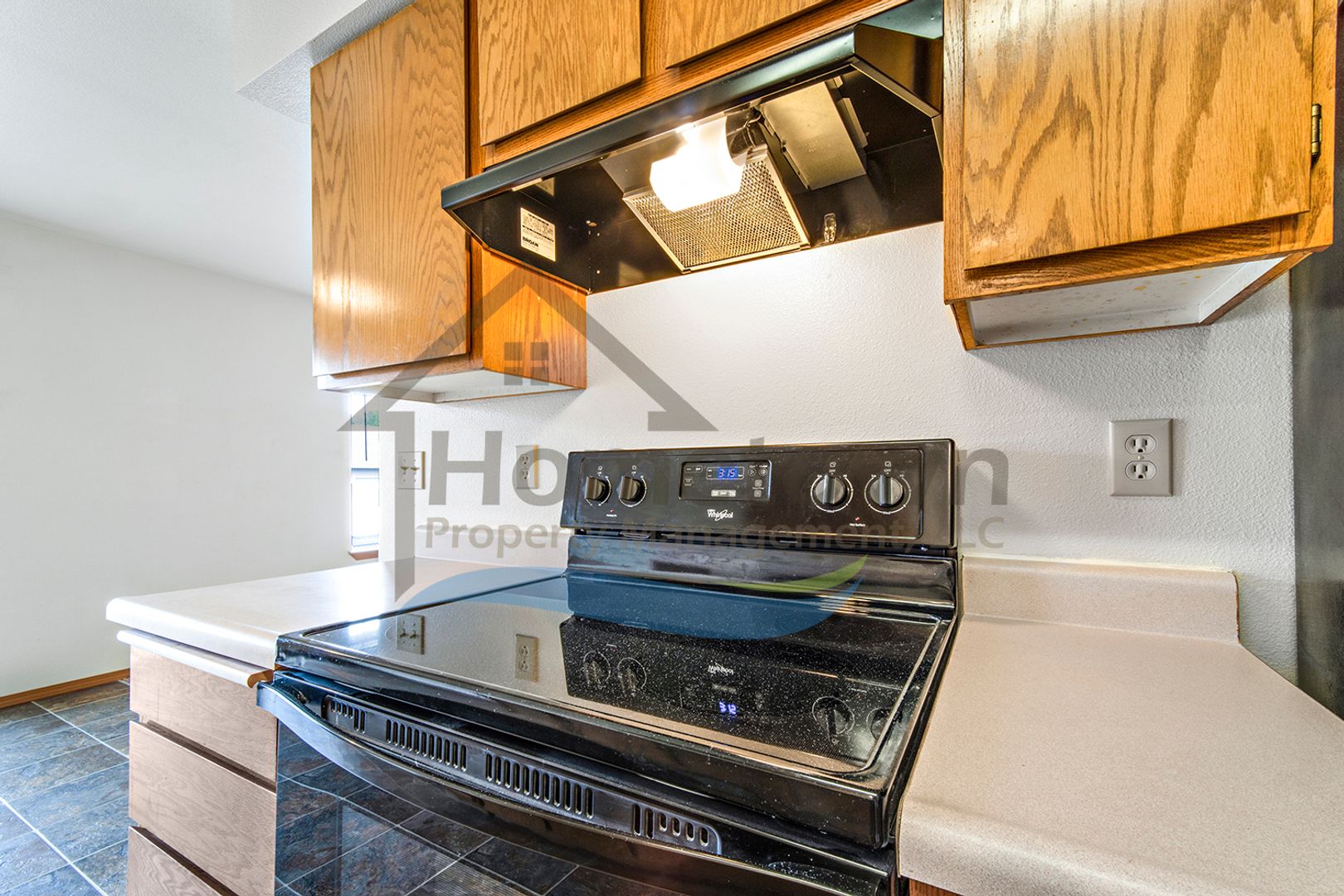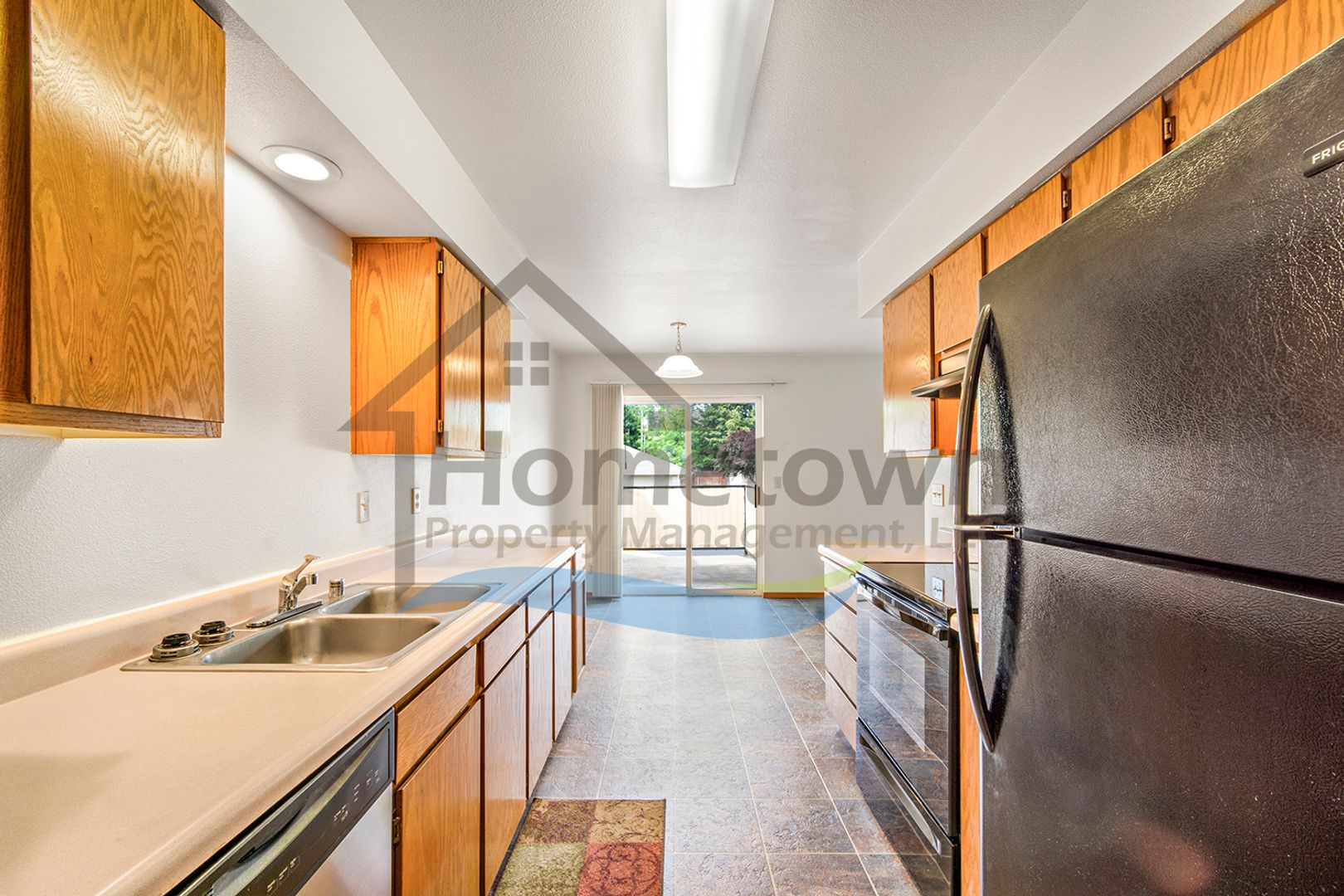 The kitchen features a large refrigerator, a stainless steel sink, an electric range and oven, and a dishwasher. A row of cupboards and drawers above and below the counters runs the length of the kitchen on both sides leading to the dining room. The dining room has its own lighting and sits next to a sliding glass door, which takes you to a private second-story patio.