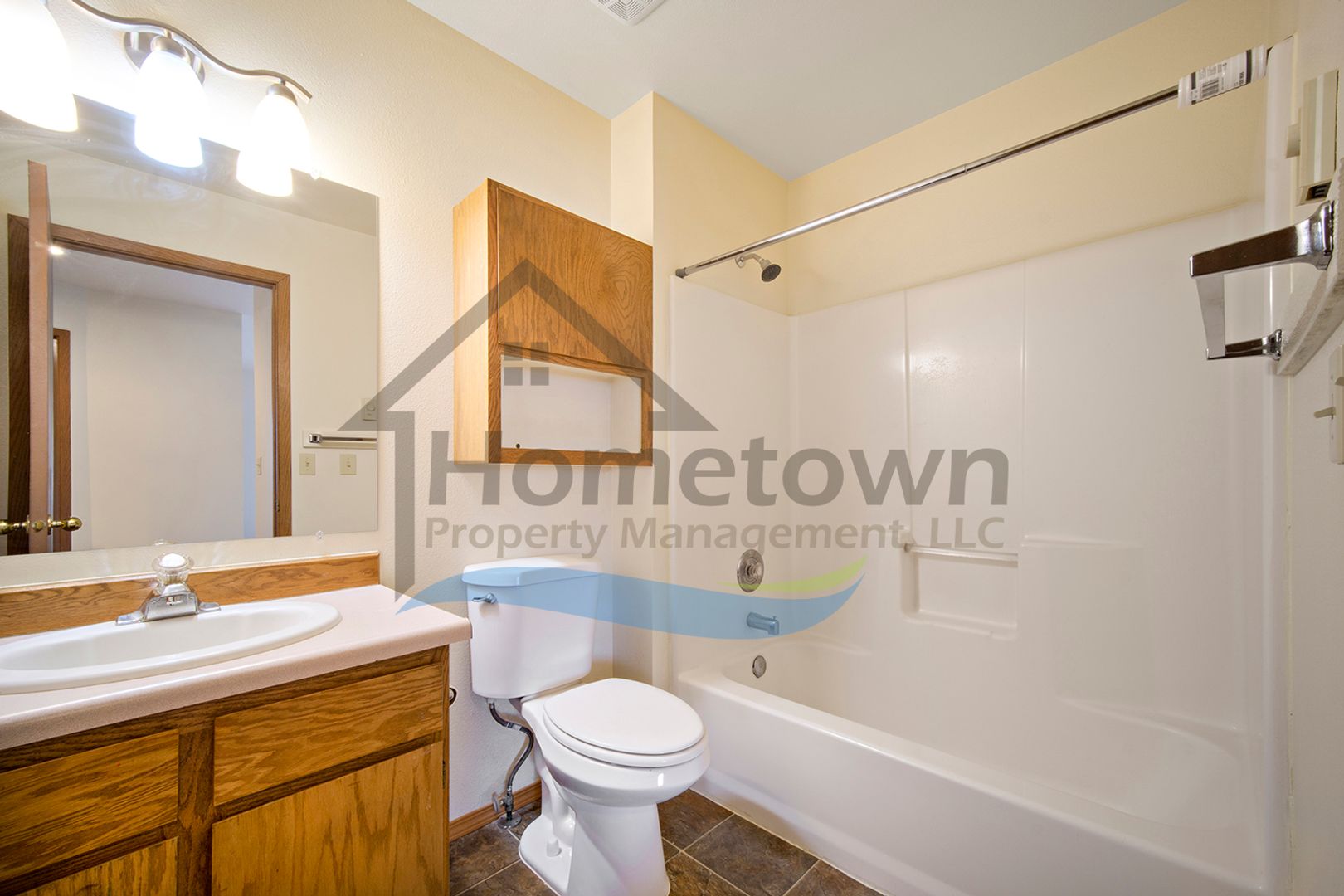 An adjacent hallway leads to the bedrooms and to the bathroom. Both bedrooms feature wide sliding double-door closets. The bathroom is a full bath with a tub, a shower, and a sink vanity with cupboards and drawers.